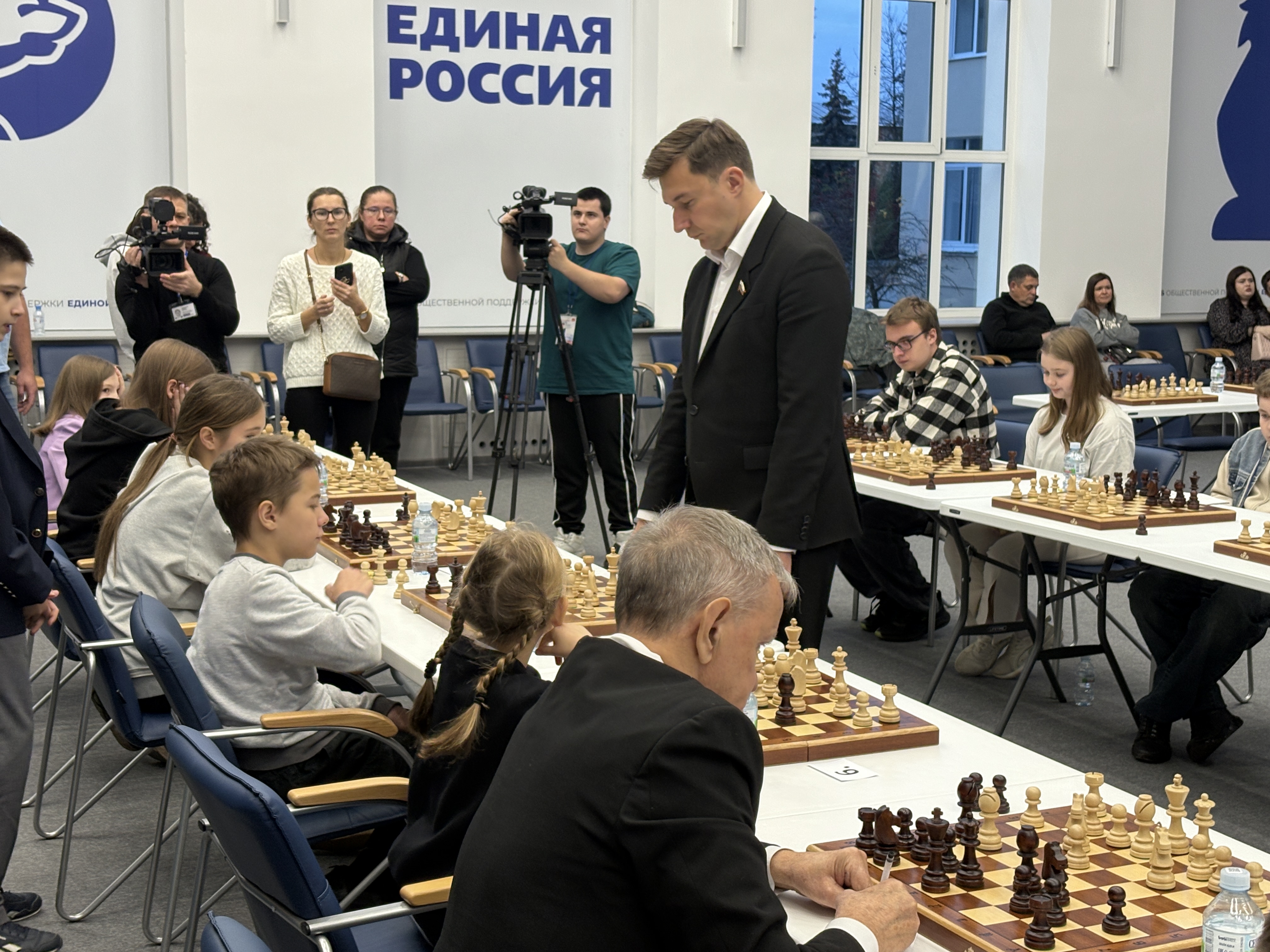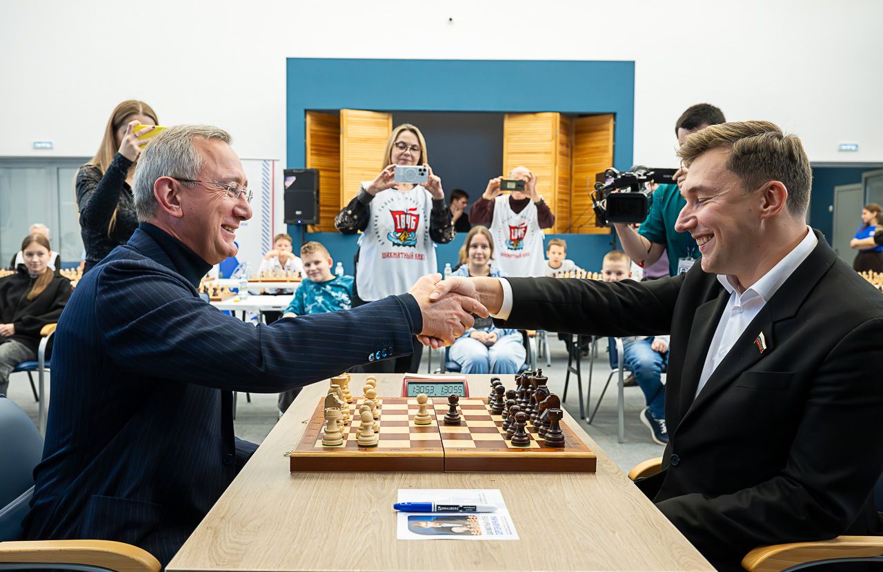 Гроссмейстер, вице-чемпион мира по шахматам, сенатор Сергей Карякин провёл на открытии шахматных клубов сеансы одновременной игры в шахматы с подрастающими чемпионами.