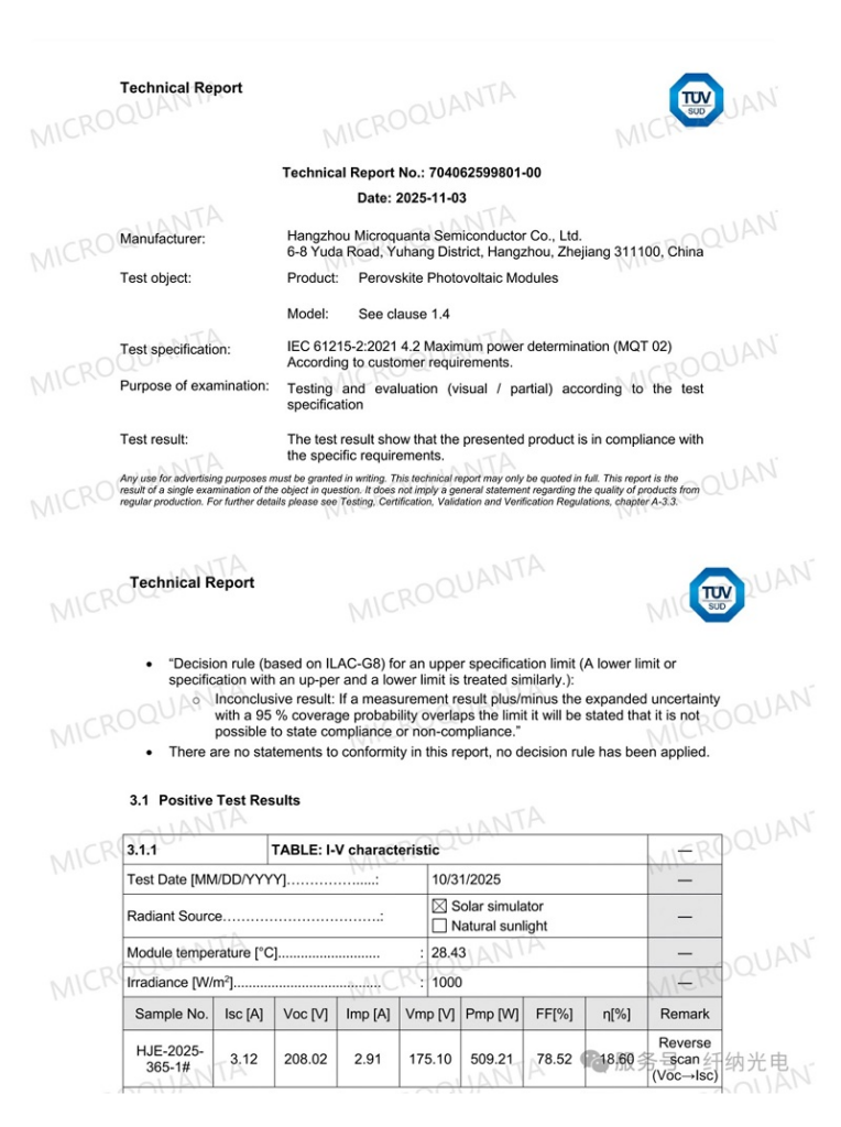 Отмечается, что Microquanta добилась двойного прорыва: в оптимизации состава перовскитного материала и разработке процесса осаждения пленок большой площади. Компания успешно преодолела давние проблемы недостаточной однородности и плохой повторяемости процесса осаждения пленок большой площади, которые сдерживали развитие отрасли. Это не только позволило производить высокоэффективные крупногабаритные модули, но и обеспечило их превосходную долгосрочную стабильность.
