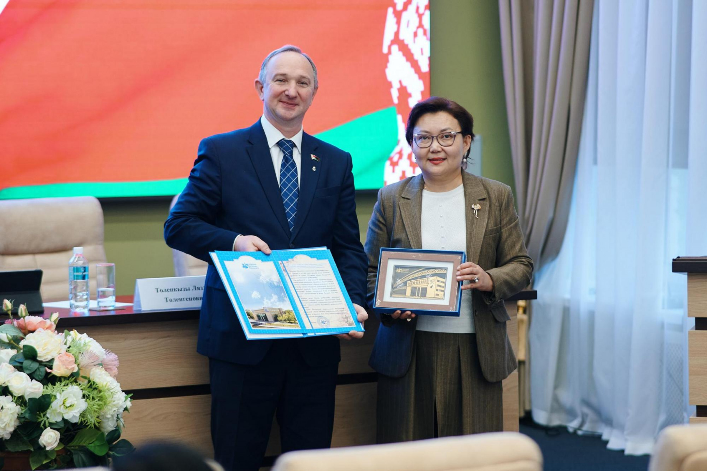 Далее последовали доклады участников заседания. Об итогах выполнения плана мероприятий Научно-образовательного консорциума между высшими учебными заведениями и НИИ Республики Беларусь и Республики Казахстан в 2023–2025 годах сообщили Сергей Харитончик и проректор по социальному и инфраструктурному развитию ЕНУ им. Л. Н. ГумилеваЛяззат Толенкызы. Во время заседания проректор также вручила ректору БНТУ памятный подарок в честь плодотворного сотрудничества.
