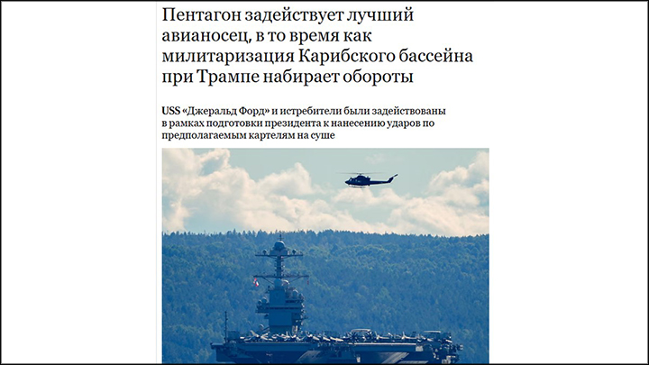 Штаты направили в бассейн Карибского моря самый современный авианосец Пентагона USS Gerald Ford. На его борту находятся несколько десятков истребителей F-35C Lightning II, истребителей-бомбардировщиков F/A-18E/F Super Hornet, а также самолётов-разведчиков. Он прибудет к берегам Венесуэлы в ближайшее время, сообщает британское издание The Guardian.