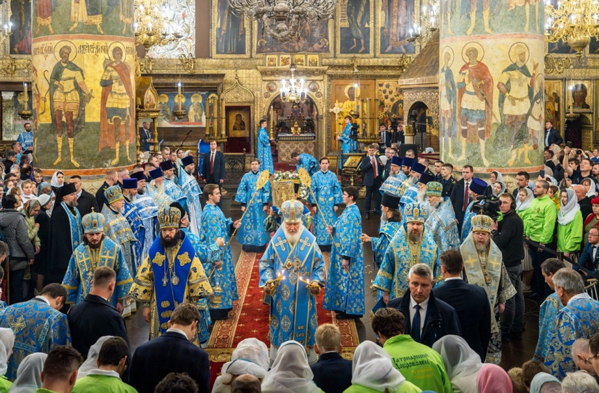 Еще раз поздравляю вас с этим замечательным праздником, с этим событием. Вспоминая героические страницы жизни народа и Церкви, конечно, нельзя еще и еще раз не возблагодарить Господа за все: за то, что мы прошли как народ, за то, что мы выжили в тяжелейших условиях физически во время войн, за то, что мы сохранили веру православную во времена страшных беспрецедентных гонений, и за то, что мы снова с вами в этом соборе всея Руси, в центре нашей Родины, в Успенском соборе, собираемся, чтобы прославить имя Господа и Спасителя нашего и возблагодарить Пречистую Царицу Небесную за Ее милость, за Ее покров над страной нашей и над всеми нами.