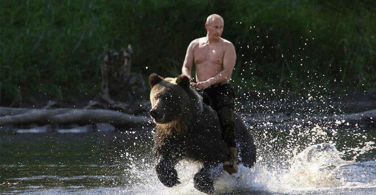 Вспоминаются и снимки, где Путин «скачет на медведе». Сам Путин говорит: «на медведе никогда не скакал, но фотографии такие есть».