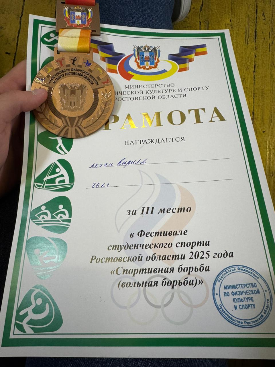 В личном зачете студент нашего Института Ахаян Кирилл, КМС по вольной борьбе, 86 кг., завоевал 3 место.