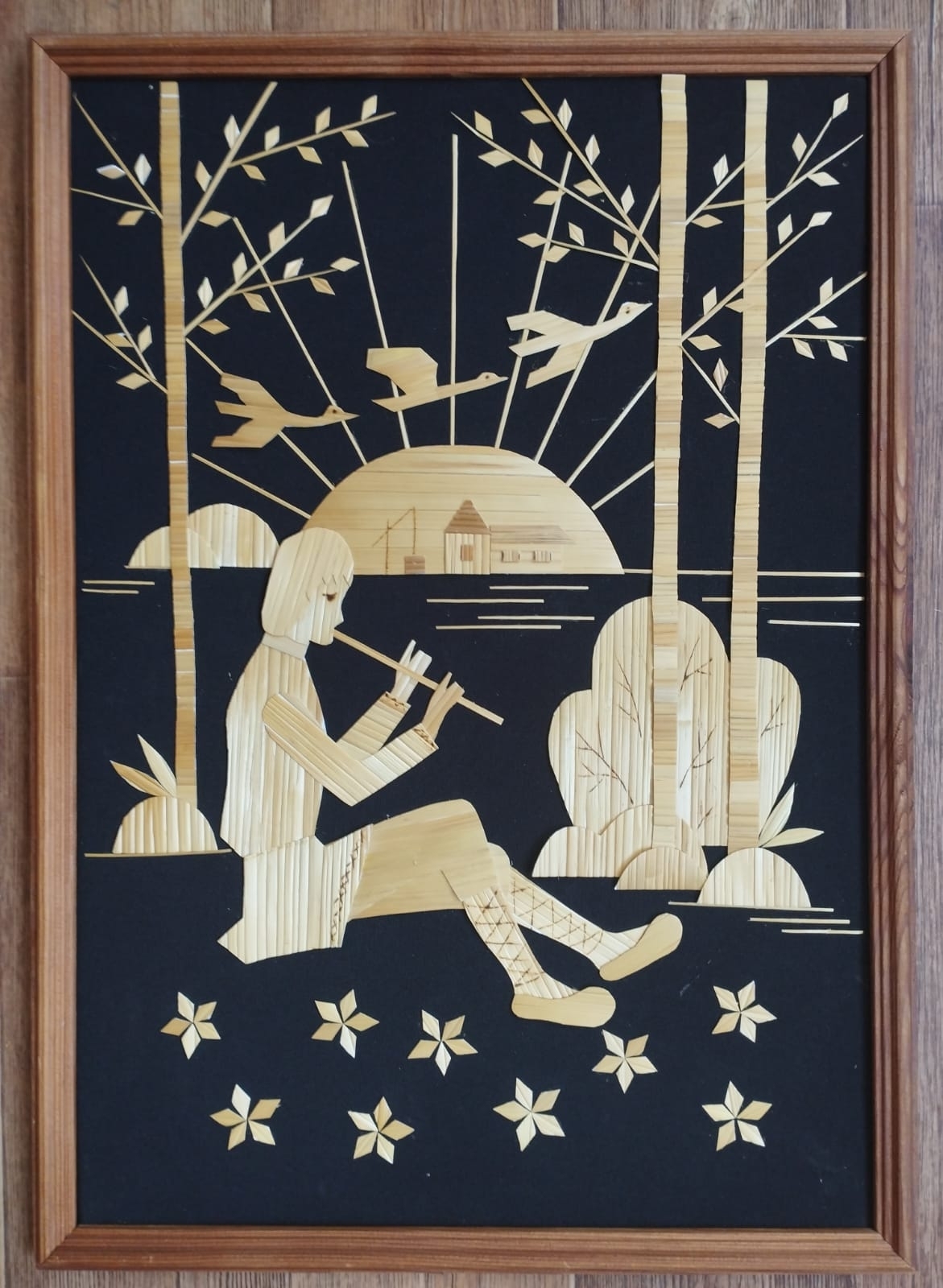 Немаловажным этапом является раскладка соломенных лент по цвету: светло-желтые, светло-коричневые, темно-коричневые – каждая группа занимает свое место. Ленты разрезаются на отрезки нужного размера, затем разрезается по прожилке пополам, одна половинка промазывается клеем и переносится на эскиз. Заготовки деталей аккуратно вырезаются по контуру. Готовые элементы собираются на фон и фиксируются клеем. После просушки работа оформляется в рамку.