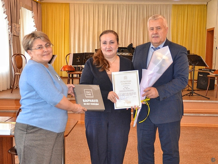 Почётные грамоты администрации города Барнаула вручили преподавателю теоретических дисциплин Олесе Канаевой, преподавателям по классу фортепиано Наталье Кононовой и Тамаре Шигиной, преподавателю по классу гитары Сергею Крайневу и преподавателю по классу хора Ларисе Рычаговой.