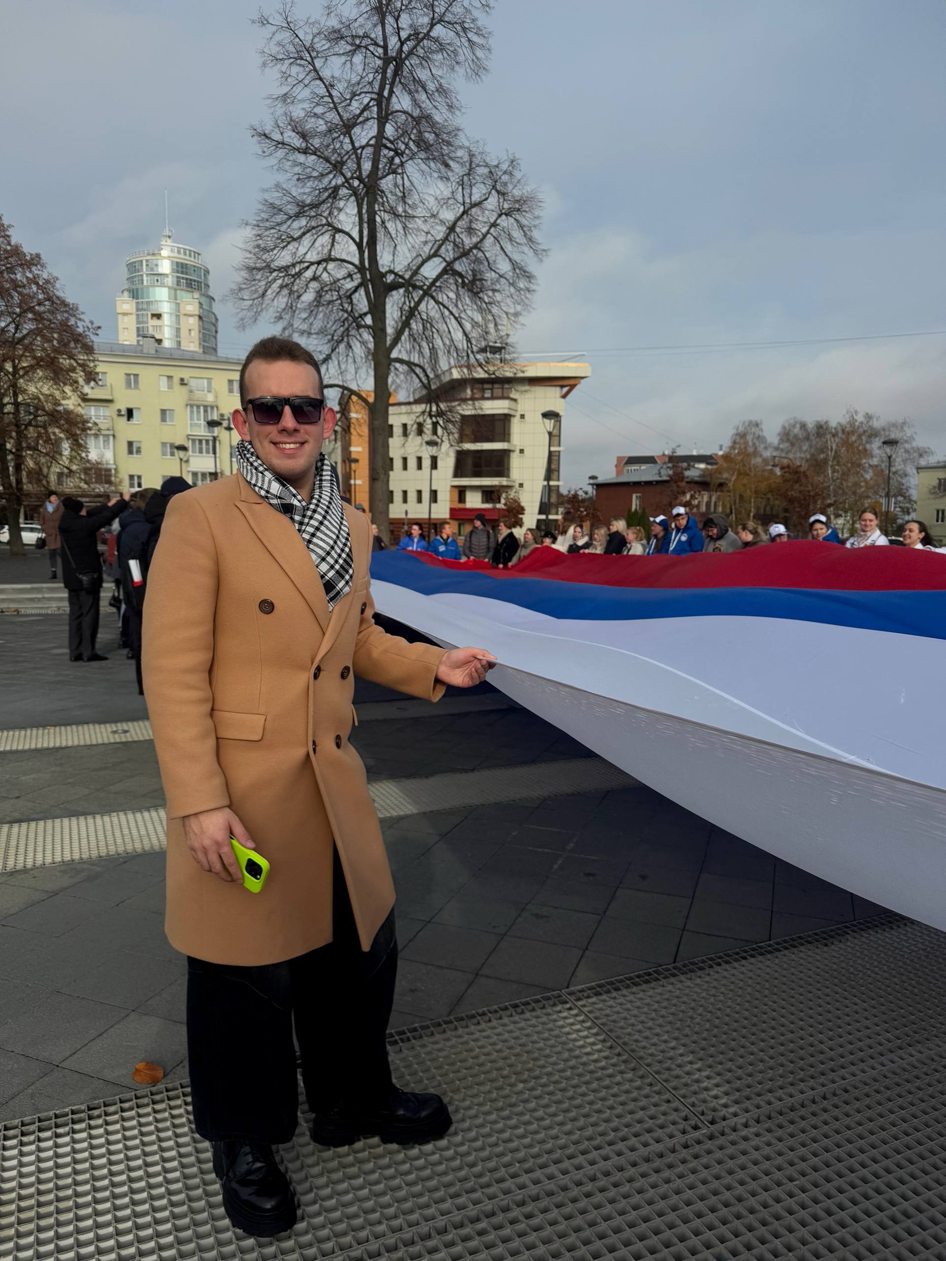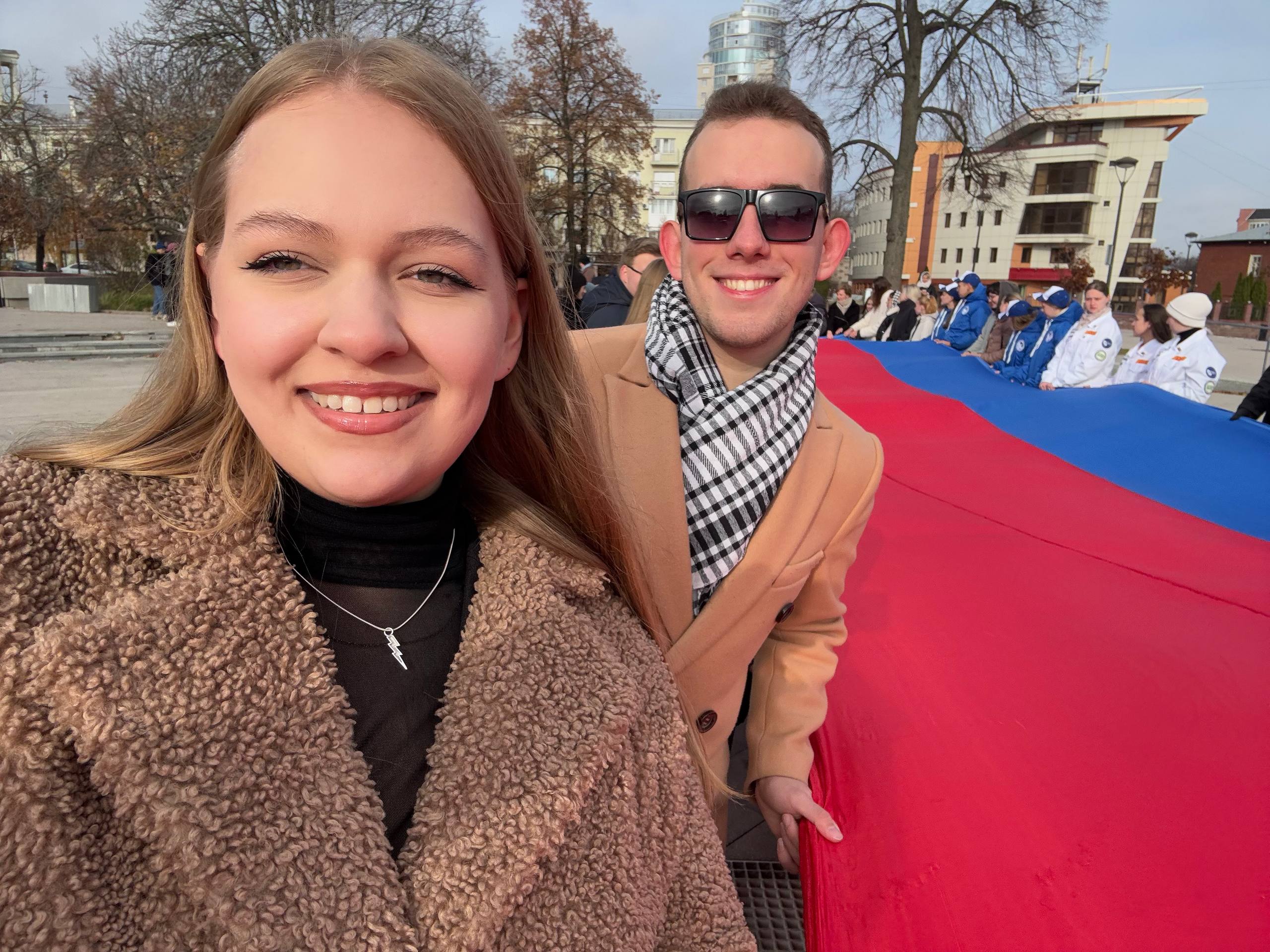 4 ноября на Советской площади г.Воронежа студенты ВГИИ Елисавета Мироненко и Михаил Митин совместно с представителями общественной организации «Молодая гвардия Единая Россия» приняли участие в патриотической акции, приуроченной ко Дню народного единства. Участники акции – воронежские студенты, школьники и представители общественных организаций, развернули стометровый российский триколор в знак сплочения и единства народа.