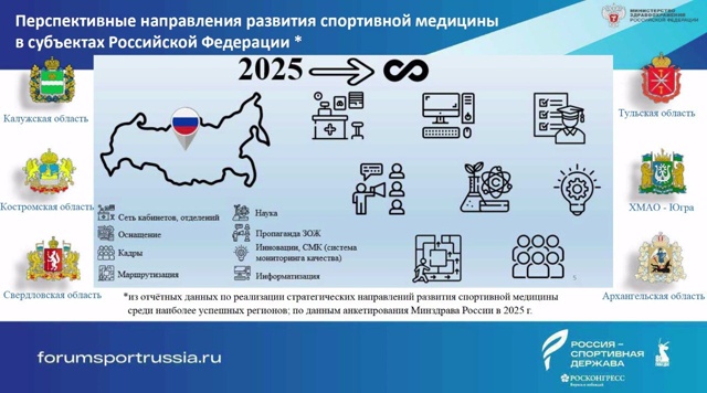 «Мы проанализировали отчеты субъектов РФ, которые в 2024-2025 годах реализуют стратегию развития спортивной медицины, - отметила Наталья Маркарян. – У нас есть 25 субъектов, которые активно реализуют не одно, а несколько направлений стратегии. Определили основные шесть самых лучших субъектов РФ – Архангельская, Калужская, Костромская, Свердловская, Тульская области, а также ХМАО-Югра.
