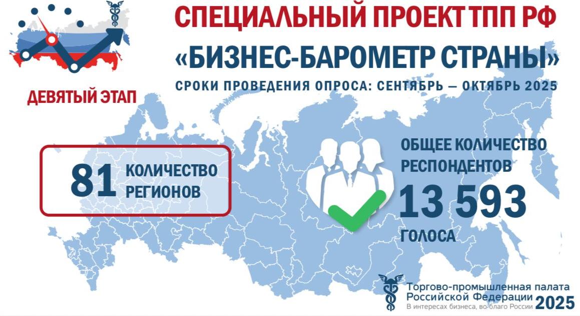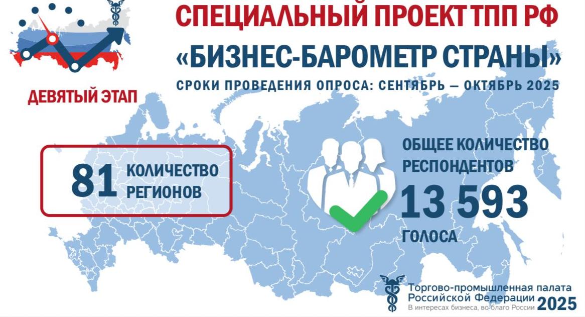 В Торгово-промышленной палате Российской Федерации (ТПП РФ) подвели итоги девятого этапа важного исследования – опроса «БИЗНЕС - БАРОМЕТР СТРАНЫ». Опрос проводился с 8 сентября 2025 года по 6 октября. В опросе приняли участие 13593 респондента из 81 региона РФ.