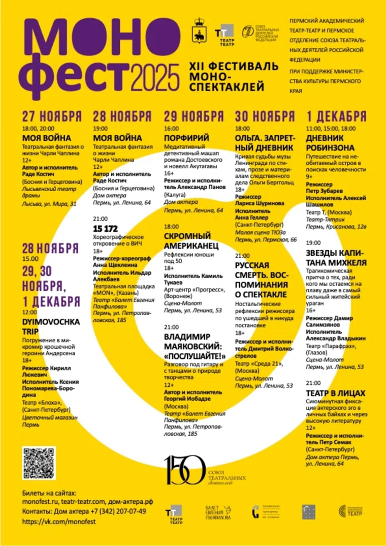 Начнется фестиваль за день до официального открытия в Лысьве. Здесь на сцене местного драмтеатра боснийский артист Раде Костич покажет свою работу о Чарли Чаплине «Моя война» (12+). Это одна из самых неординарных постановок в репертуаре фестиваля, признают организаторы. Завершится «Монофест» постановкой члена жюри фестиваля, народного артиста РФ Петра Семака, который 1 декабря сыграет часовой монолог «Театр в лицах» (12+).