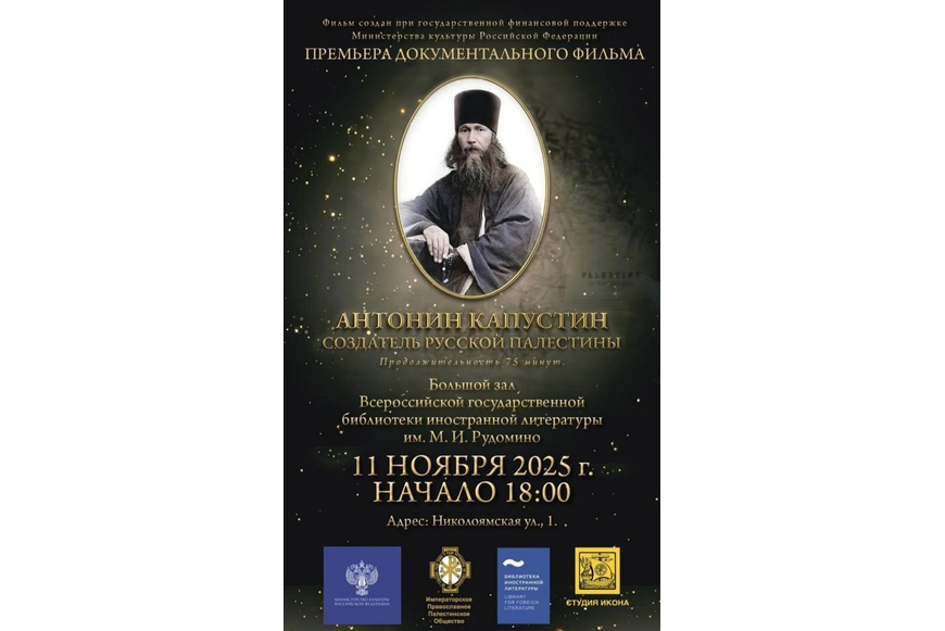 Во вторник, 11 ноября 2025 г. в 18:00 в Большом зале Всероссийской государственной библиотеки иностранной литературы имени М. И. Рудомино, состоится премьерный показ документального фильма «Антонин Капустин – создатель Русской Палестины».