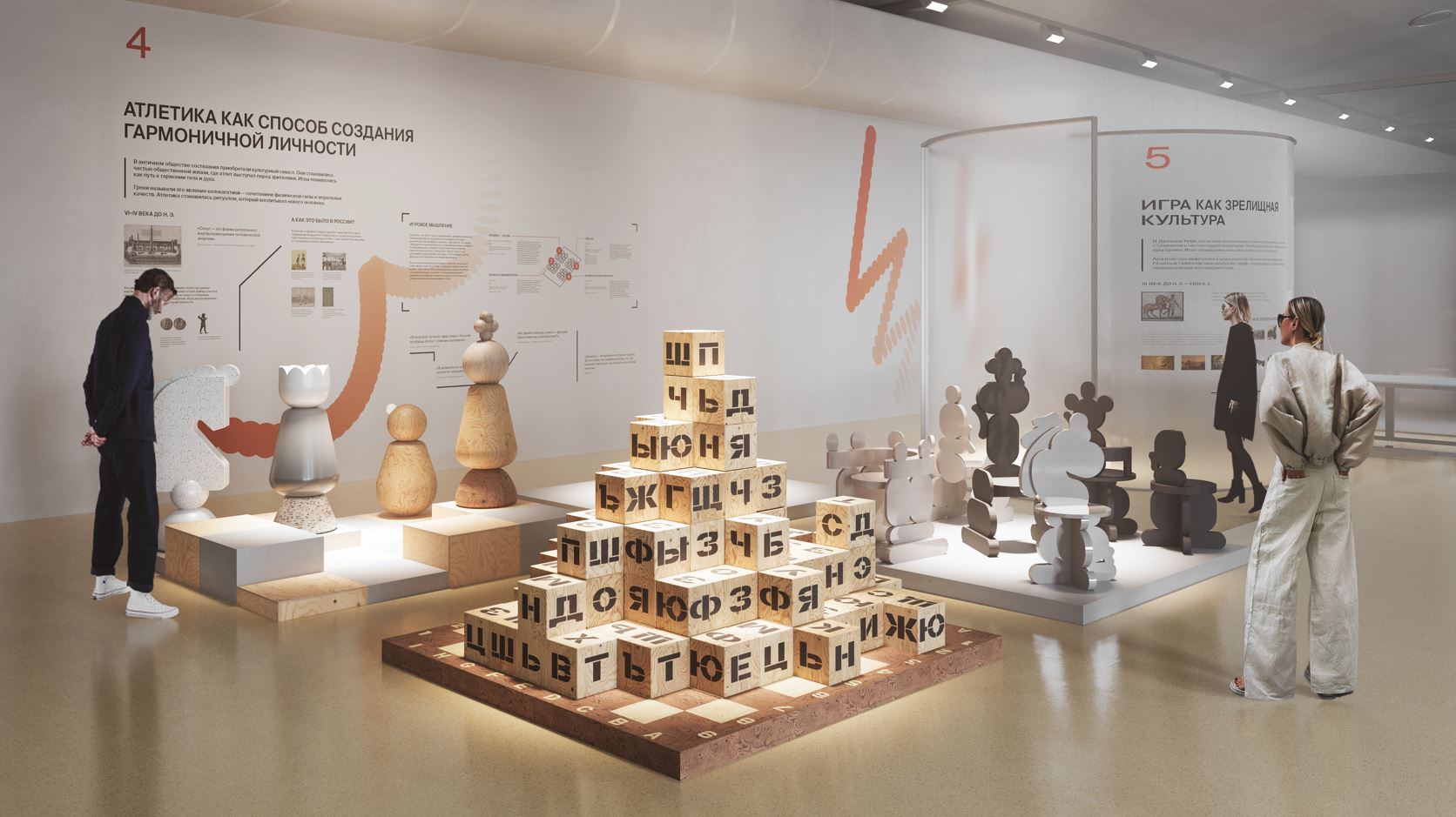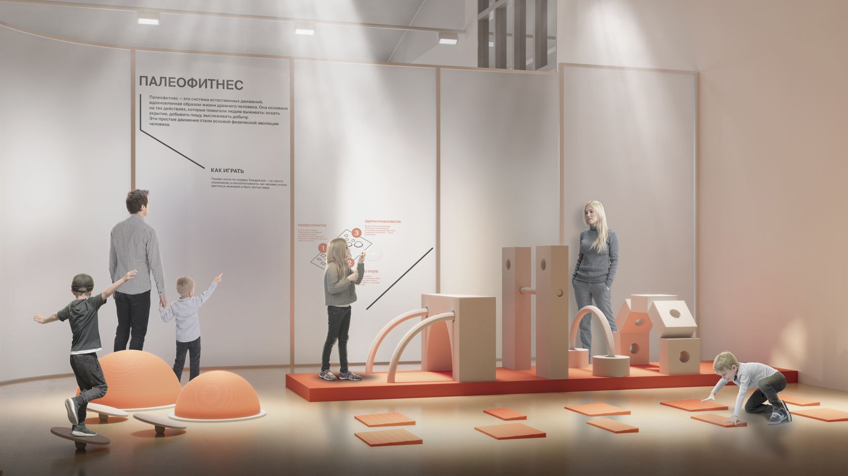 Экспозиция построена как игра, в которой зритель становится участником. По мере движения через зал можно пробовать разные виды активности — от древних игровых практик до современных спортивных симуляций. Внутри экспозиции — серия аттракционов и интерактивных зон, где спорт превращается в инструмент исследования самого себя.