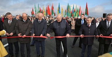 Глава государства в торжественной обстановке перерезал символическую красную ленточку. На церемонию были приглашены представители трудовых коллективов дорожных организаций, участвовавших в строительстве моста, жители Мозырского района. По сложившейся традиции ко Дню Октябрьской революции людям преподносят подарки – значимые, масштабные объекты, и обновленный мост – один из них.