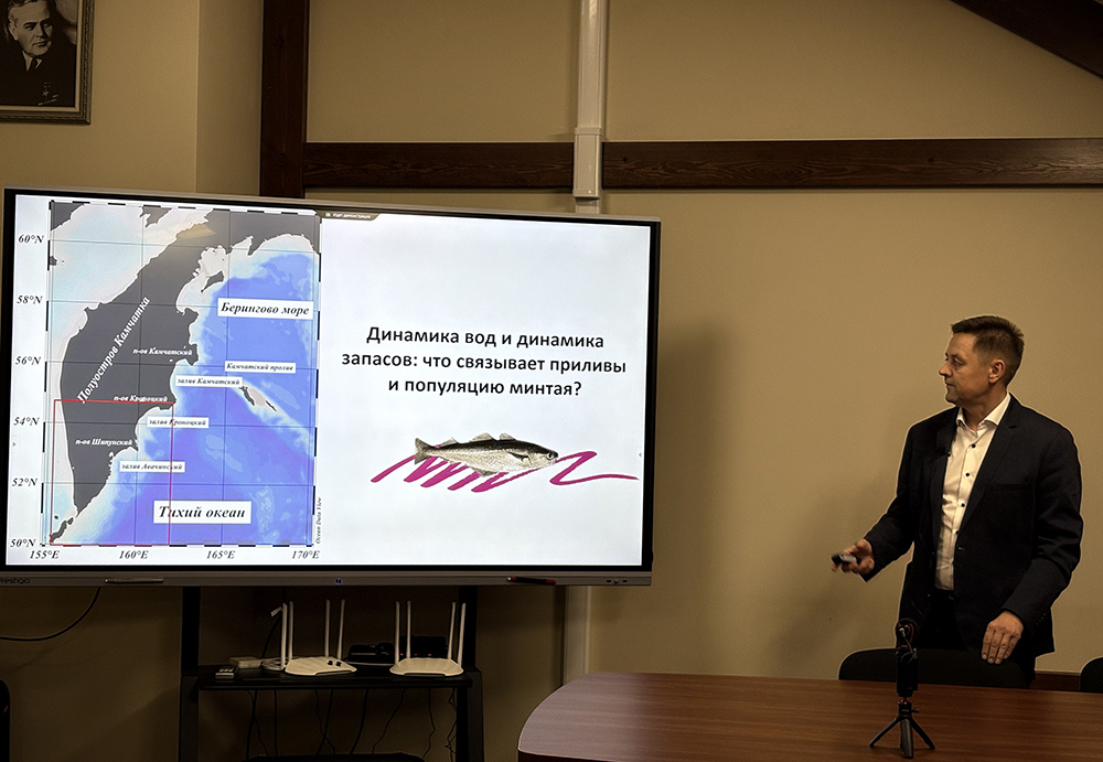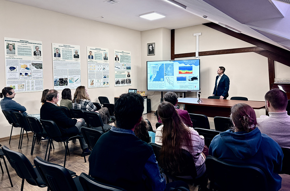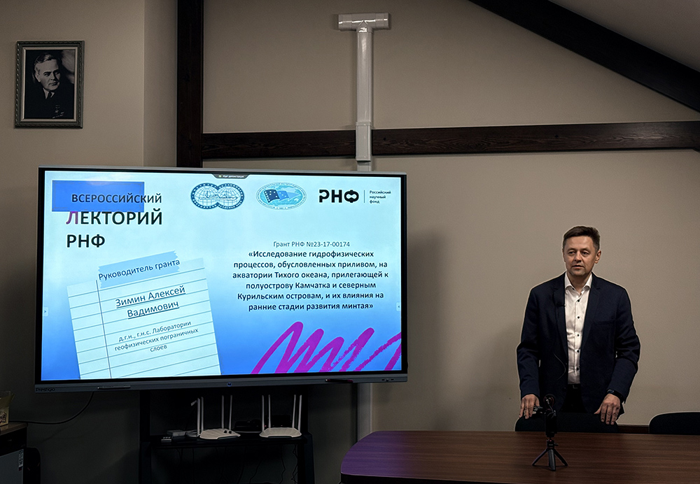 Главный научный сотрудник Лаборатории геофизических пограничных слоев Алексей Вадимович Зимин представил слушателям результаты последних исследований субмезомасштабной и приливной динамики в прибрежной зоне Камчатки. Он подробно рассказал, как локальные гидродинамические процессы влияют на развитие молоди минтая, выделив факторы, которые способствуют её росту, а также те, что создают угрозы для выживания.