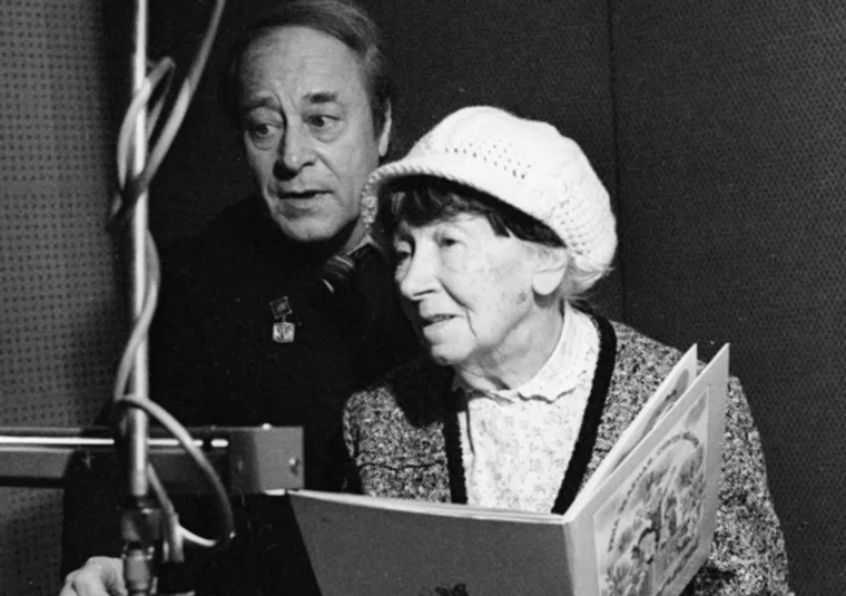 Актриса Рина Зеленая и главный редактор журнала «Колобок» Виктор Щеглов готовят запись новой сказки в студии звукозаписи Всесоюзного радио в 1987 году