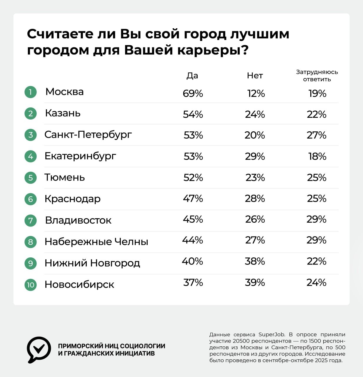 Москва, где 69% жителей рассматривают город как лучшее место для карьерного роста, заняла первое место. На втором месте оказалась Казань (54%), опередившая Санкт-Петербург с 53%. В пятёрку также вошли Екатеринбург (53%), Тюмень (52%) и Краснодар (47%). Владивосток занял достойное седьмое место с 45% жителей, уверенных в своих профессиональных возможностях.