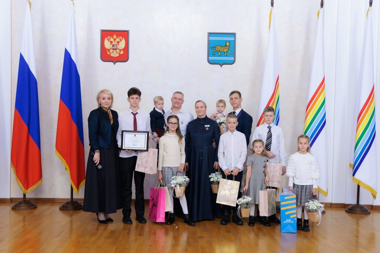 Также глава региона вручила землякам медали "За доблестный труд" I и III степени, медаль "Доброволец Еврейской автономной области", Почетную грамоту ЕАО, Благодарности губернатора области. Павел и Евгения Гуцан награждены медалями "Доброта и Забота". Впервые в истории региона такую награду вручили семье. Супруги воспитали троих детей. Двое сыновей и внук служат в силовых структурах, а дочь трудится в сфере здравоохранения.