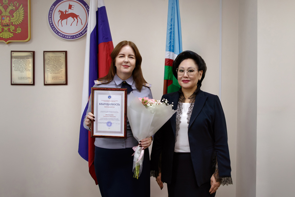 За вклад в дело защиты конституционных прав и свобод граждан, освещение в средствах массовой информации мероприятий по пробации и эффективное взаимодействие Уполномоченный по правам человека в Республике Саха (Якутия) Сардана Гурьева наградила начальника пресс-службы УФСИН Светлану Афанасьеву Благодарностью.