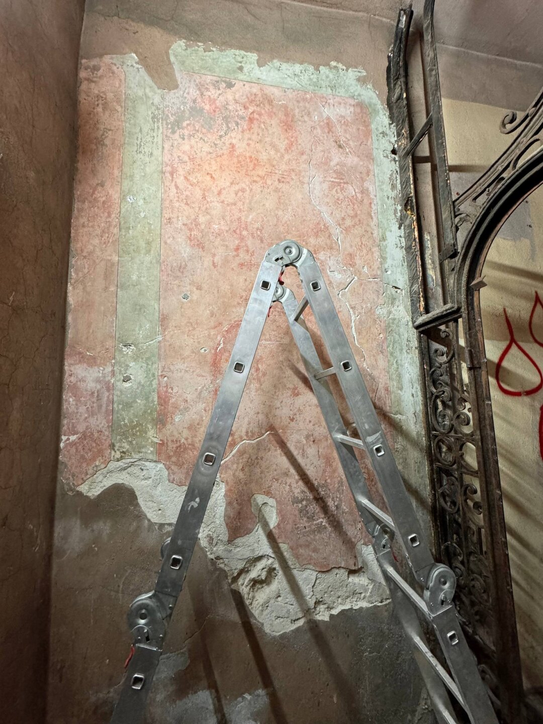 Перед входом в дом на стенах под слоями краски команда «Гэнгъ» обнаружила старинные росписи. «Это обычная для своего времени разделка под мрамор, то есть абстрактная роспись, которая имитирует рисунок камня. Мы расчистили ее на одной стене, укрепили и закрыли прозрачным защитным листом. Я не знаю других росписей такого типа, открытых за последние лет десять», — отмечает соосновательница «Гэнгъ».