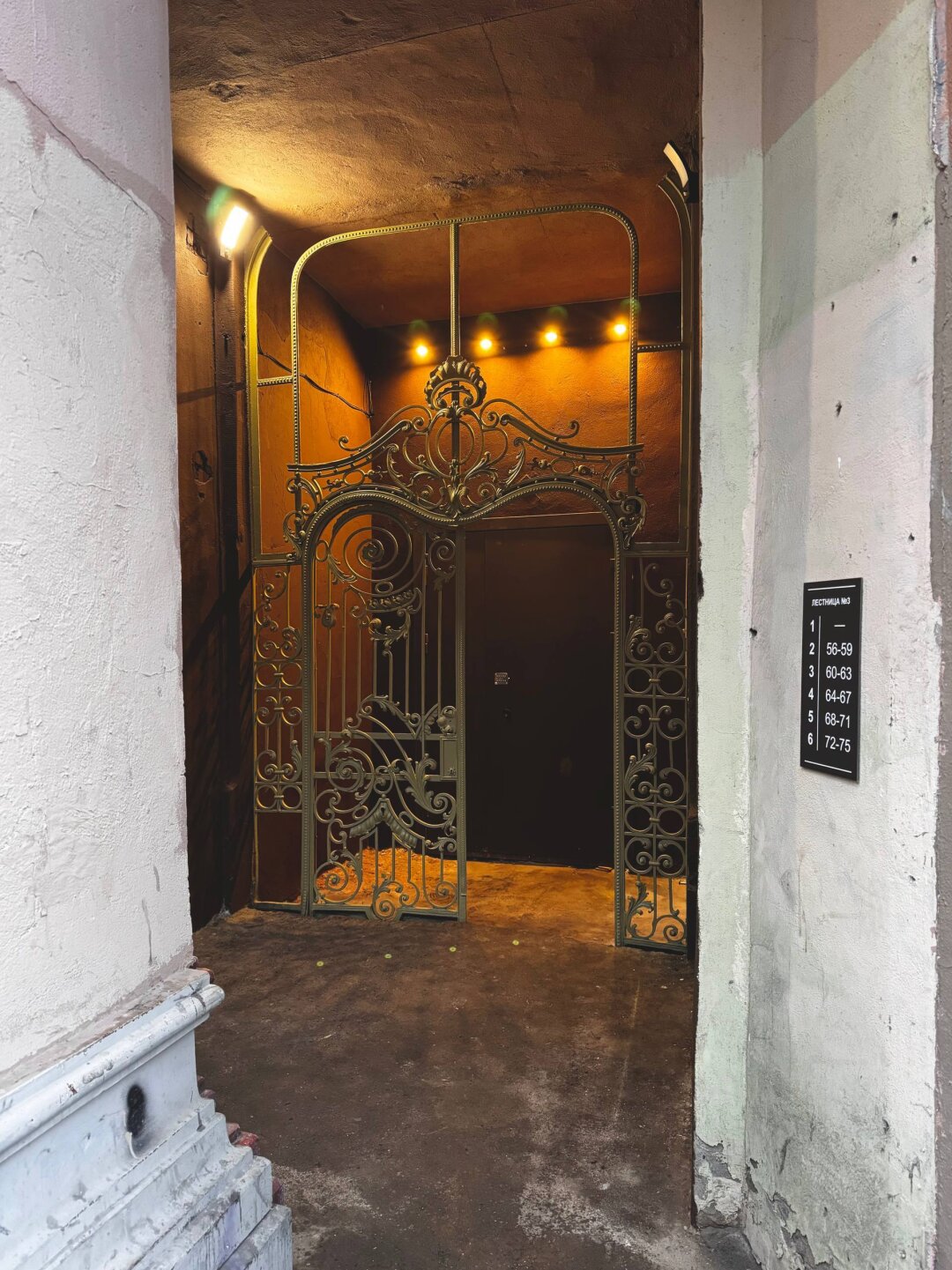 Волонтеры заметили, что под фонарем зашит вход в парадную. Выяснилось, что им не пользовались с девяностых — все это время жители дома заходили к себе со двора, а не с улицы. Чтобы открыть его, волонтеры срезали три слоя металла, выгребли мусор и нашли кованые ворота, которые вели внутрь. Команда загорелась идеей вернуть исторический вход.