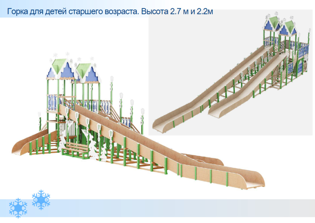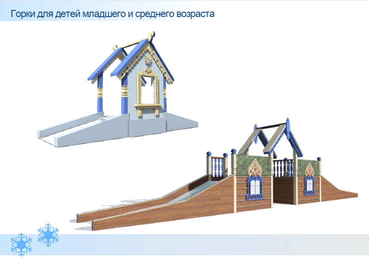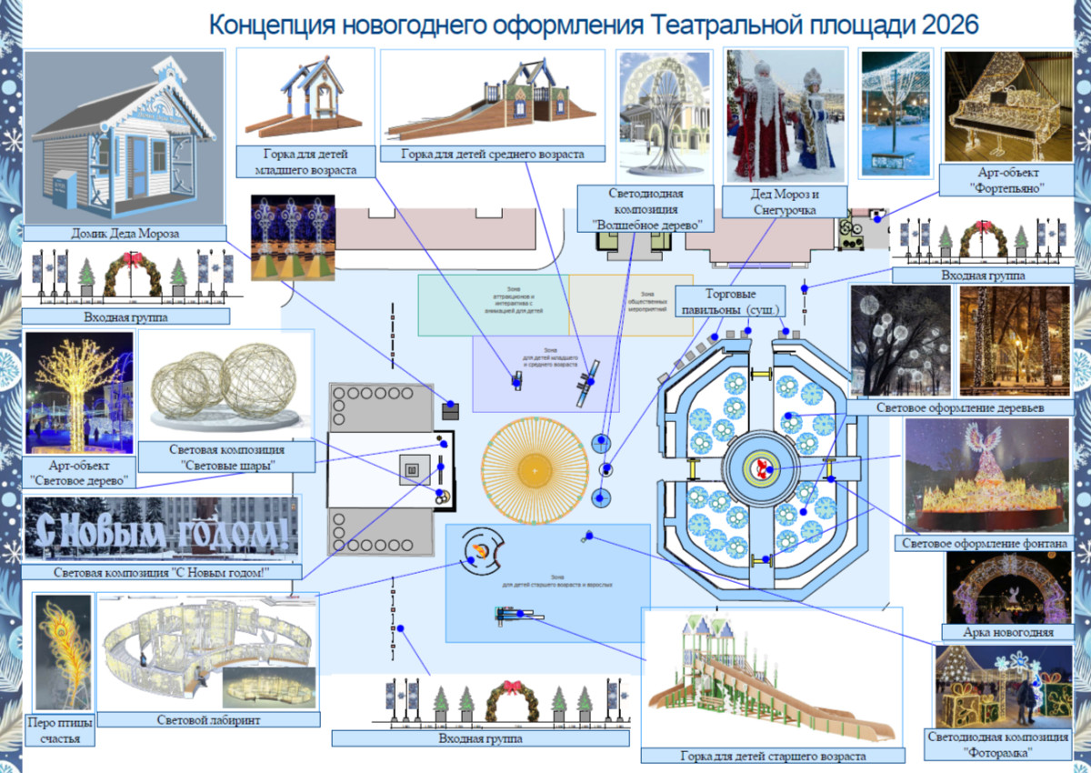Рядом появятся фигуры Деда Мороза и Снегурочки, а по бокам от главных новогодних персонажей установят световую композицию «Волшебное дерево». На площади традиционно будет установлен световой лабиринт, украшенный световым «пером птицы счастья» и три горки, рассчитанные на разные возрастные группы детей. За ёлкой разместят домик Деда Мороза.