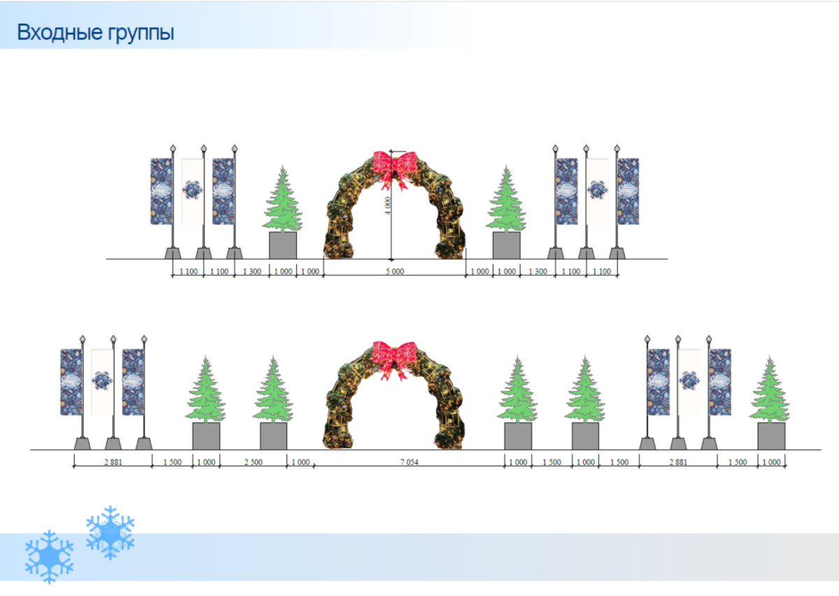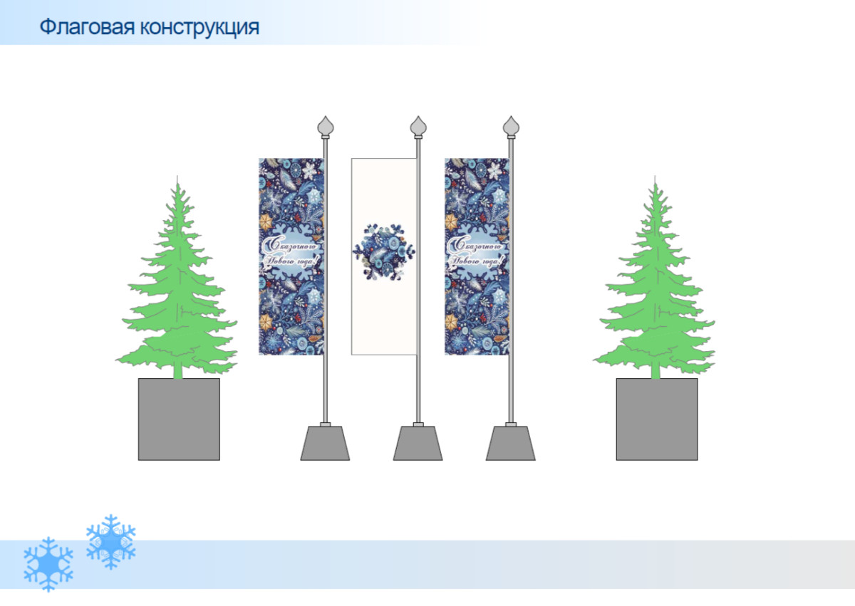 Деревья в зоне фонтана украсят гирляндами и шарами, установят световые тоннели из арок, а на самом фонтане появится большая светящаяся Жар-птица. На входных группах разместят флаговые конструкции с новогодними рисунками.