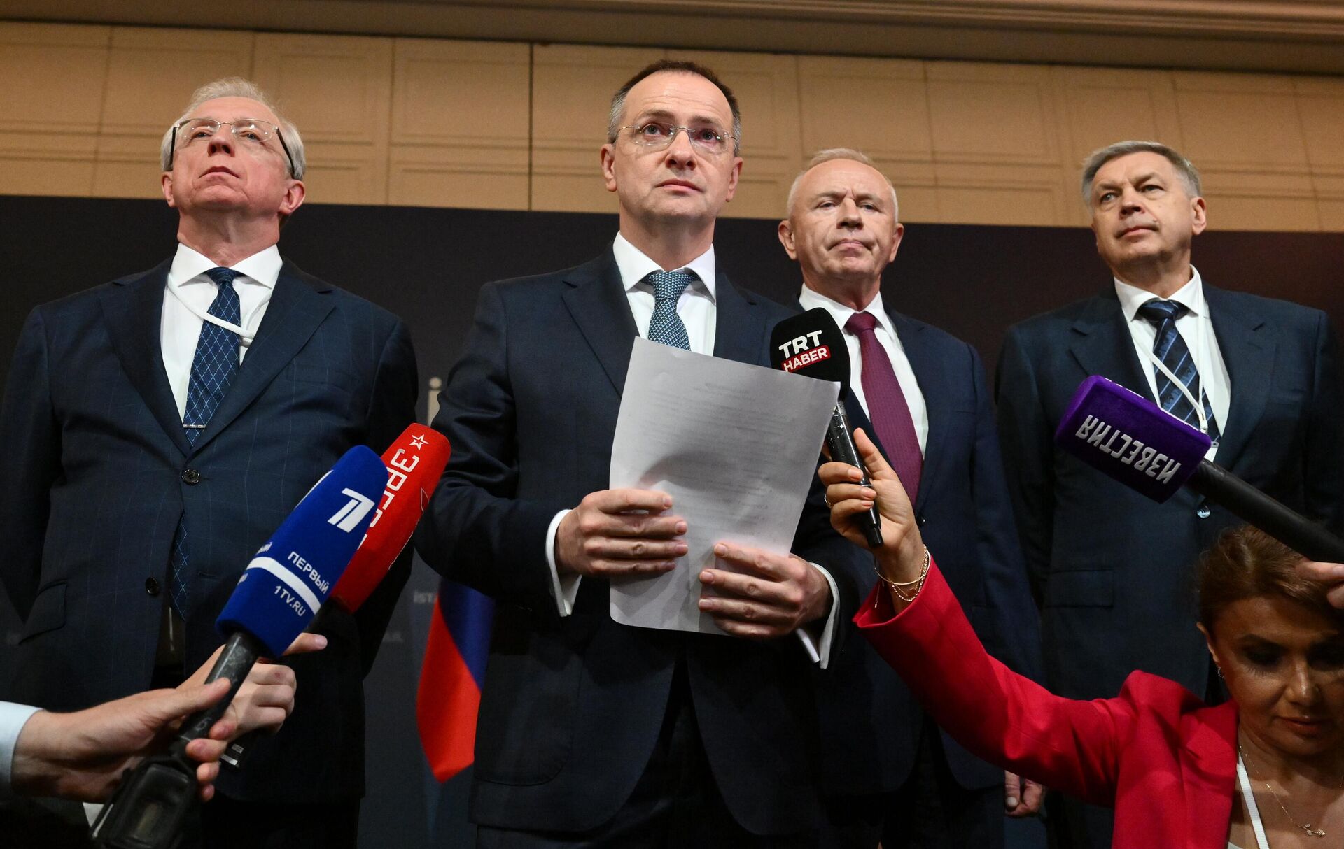Замминистра иностранных дел РФ Михаил Галузин, помощник президента РФ Владимир Мединский, замминистра обороны РФ Александр Фомин и начальник Главного разведывательного управления Генштаба ВС РФ - заместитель начальника Генштаба ВС РФ Игорь Костюков во время пресс-подхода после переговоров между делегациями России и Украины в Стамбуле
