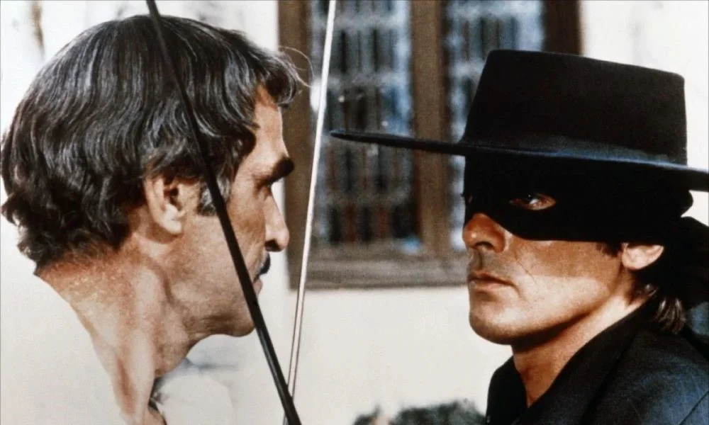 За два десятилетия до того, как чеканные штрихи рапиры андалусийца Антонио Бандераса вписали его имя в историю кино плаща и шпаги, смаковал образ Робина Гуда на испанский лад и наш французский удалец. Делону, кстати, было не впервой весело махать шпагой, скрывая разгоряченное нутро под черными одеяниями – в ретро-боевичке «Черный тюльпан» он уже приоткрывал завесу своего юмористического таланта. И далее продолжил шагать в ту же трагикомедийную степь в образе двойного агента под знаком Z. Ночью его Диего – великий уравнитель Зорро, чьи ищущие справедливости глазенки поблескивают сквозь прорези небезызвестной маски, а днем – недалекий и безоружный псевдогубернатор Мигель.