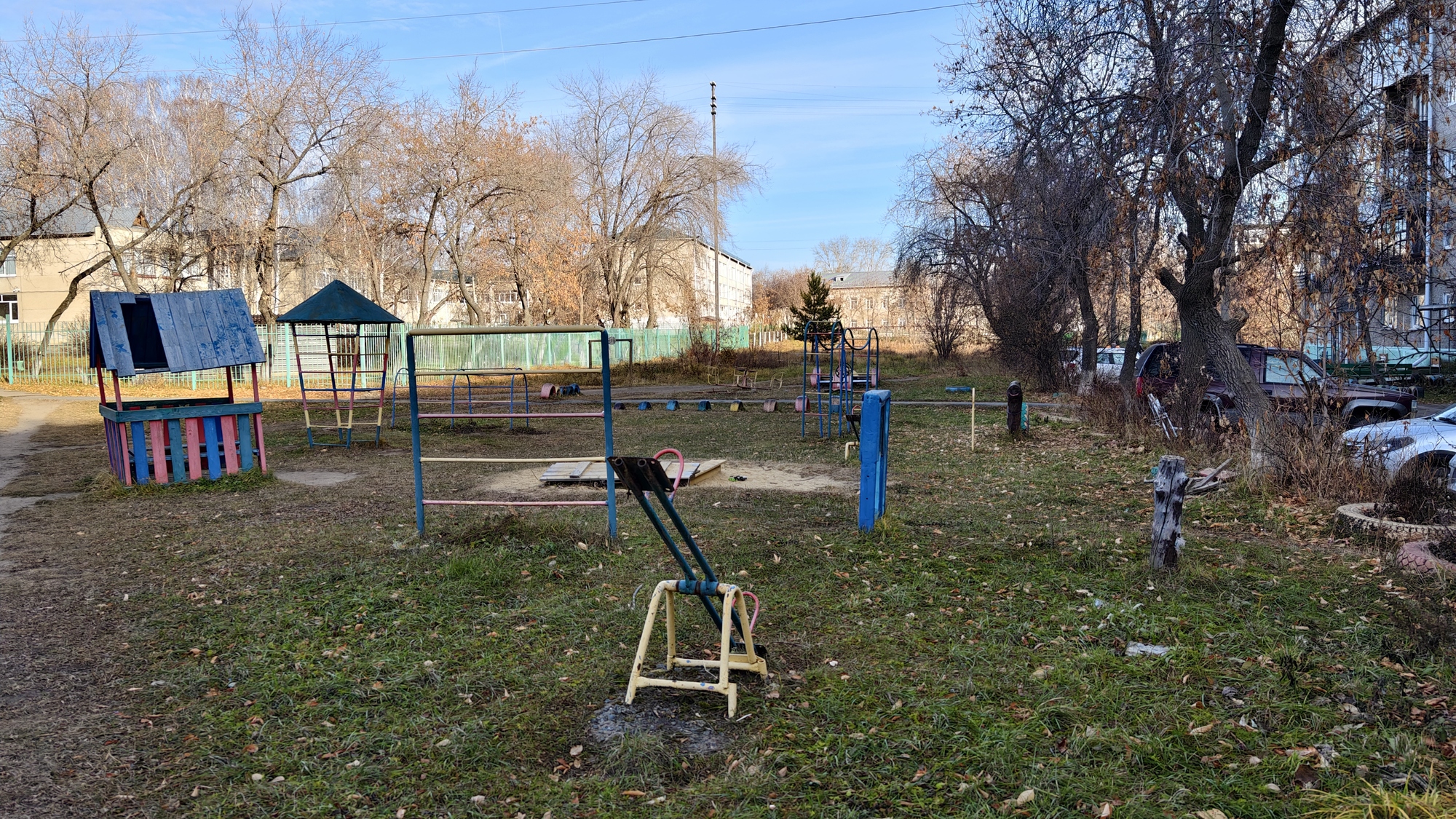 Она удалена от основных дорог. Лет 15 лет назад она отвечала требованиям безопасной эксплуатации, но теперь же площадка в плачевном состоянии. Она не отвечает теперешним нормативам, так как все машинка, корабли, карусели, качели на ней — в разрушенном состоянии, а в песочнице играть может только один ребенок.