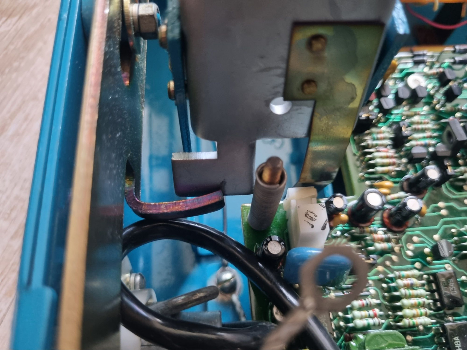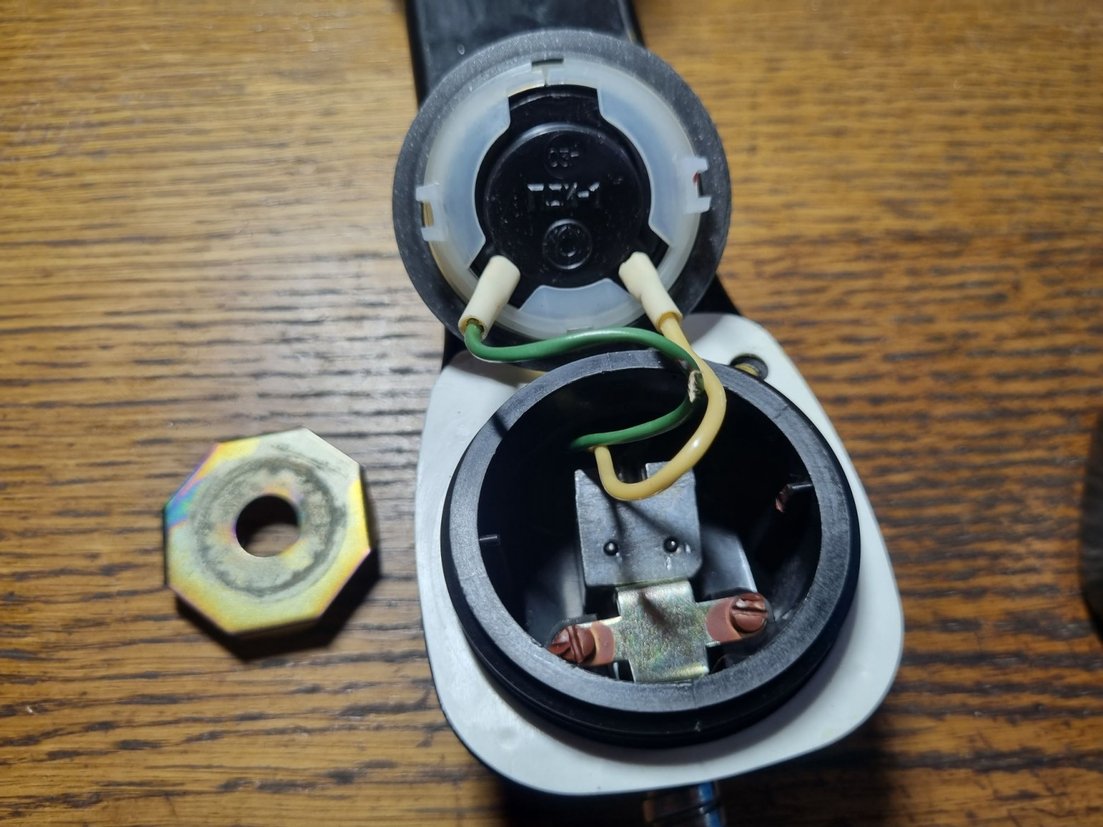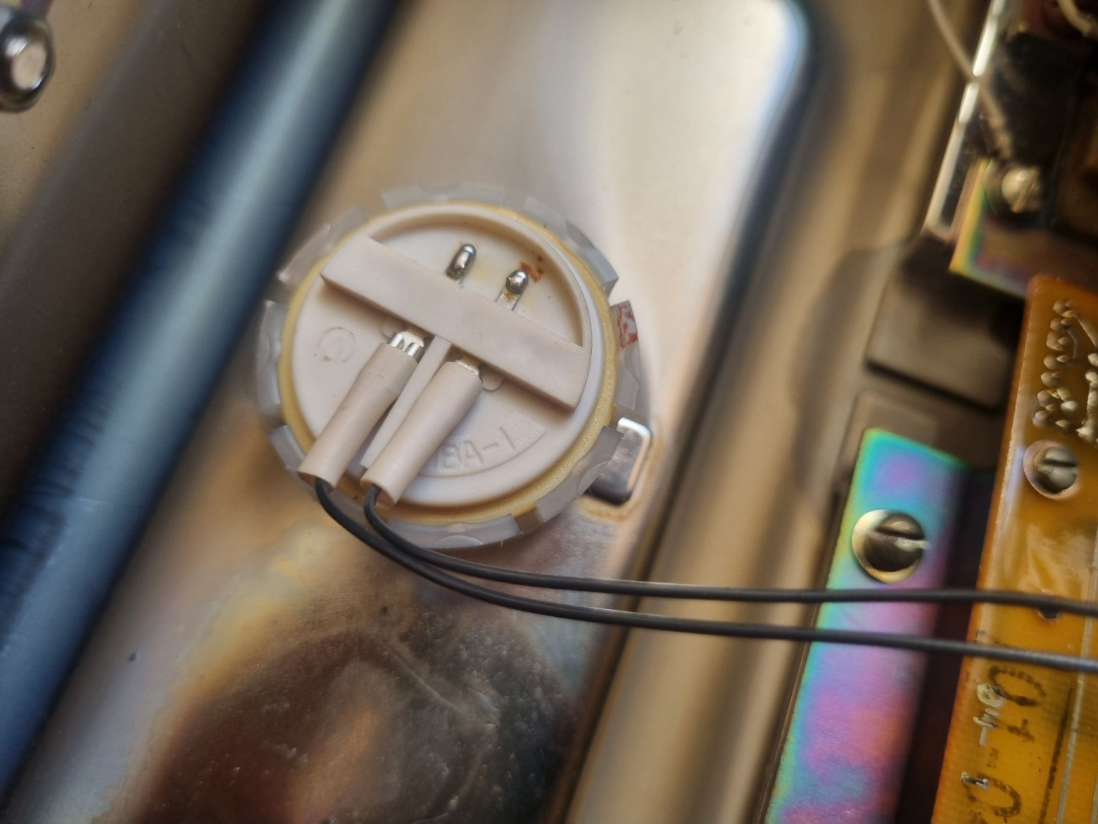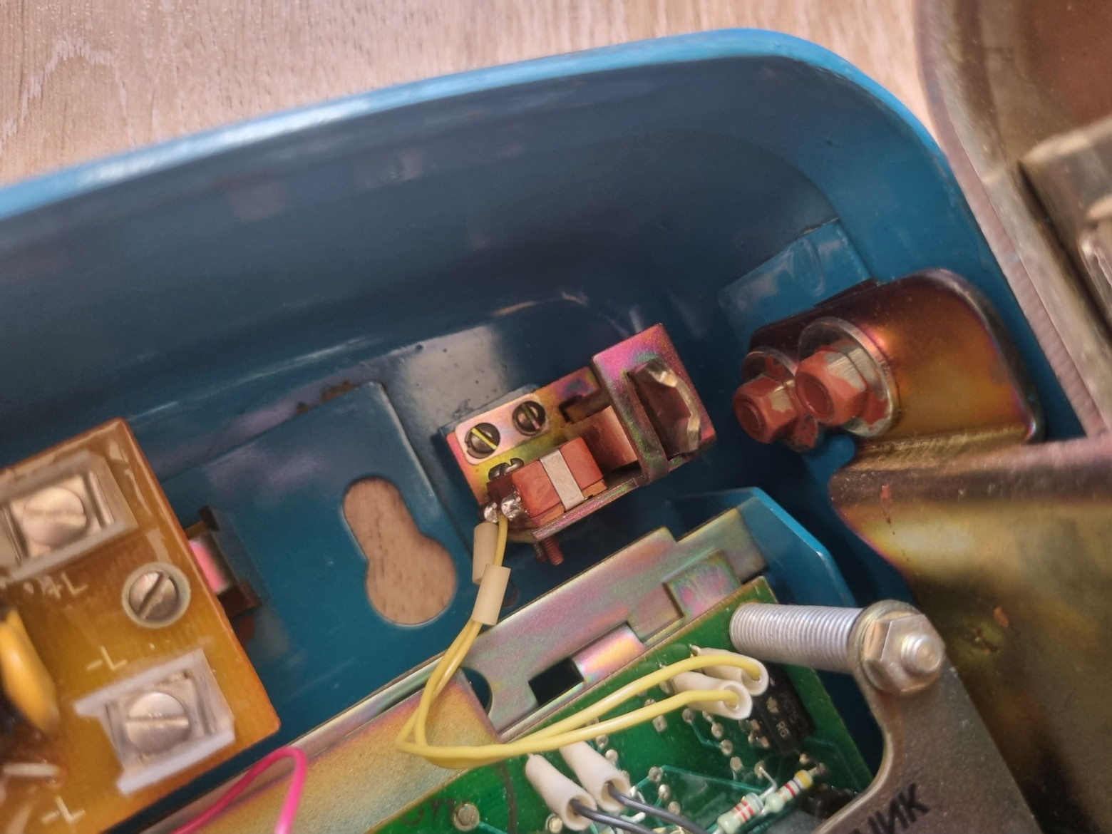 Пластилиновая пломба давно задубела и открутилась прямо вместе с гайкой. Откручиваем всё остальное и получаем возможность взглянуть на плату управления.