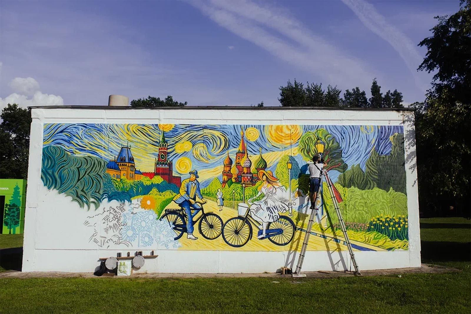 Граффити «Лунная площадь» Василия Родионова появились на Севастопольском проспекте (дом 17а, строение 1). Художник вдохновился картинами Винсента Ван Гога и использовал его знаменитую технику, изобразив Красную площадь в стиле всемирно известного постимпрессиониста.