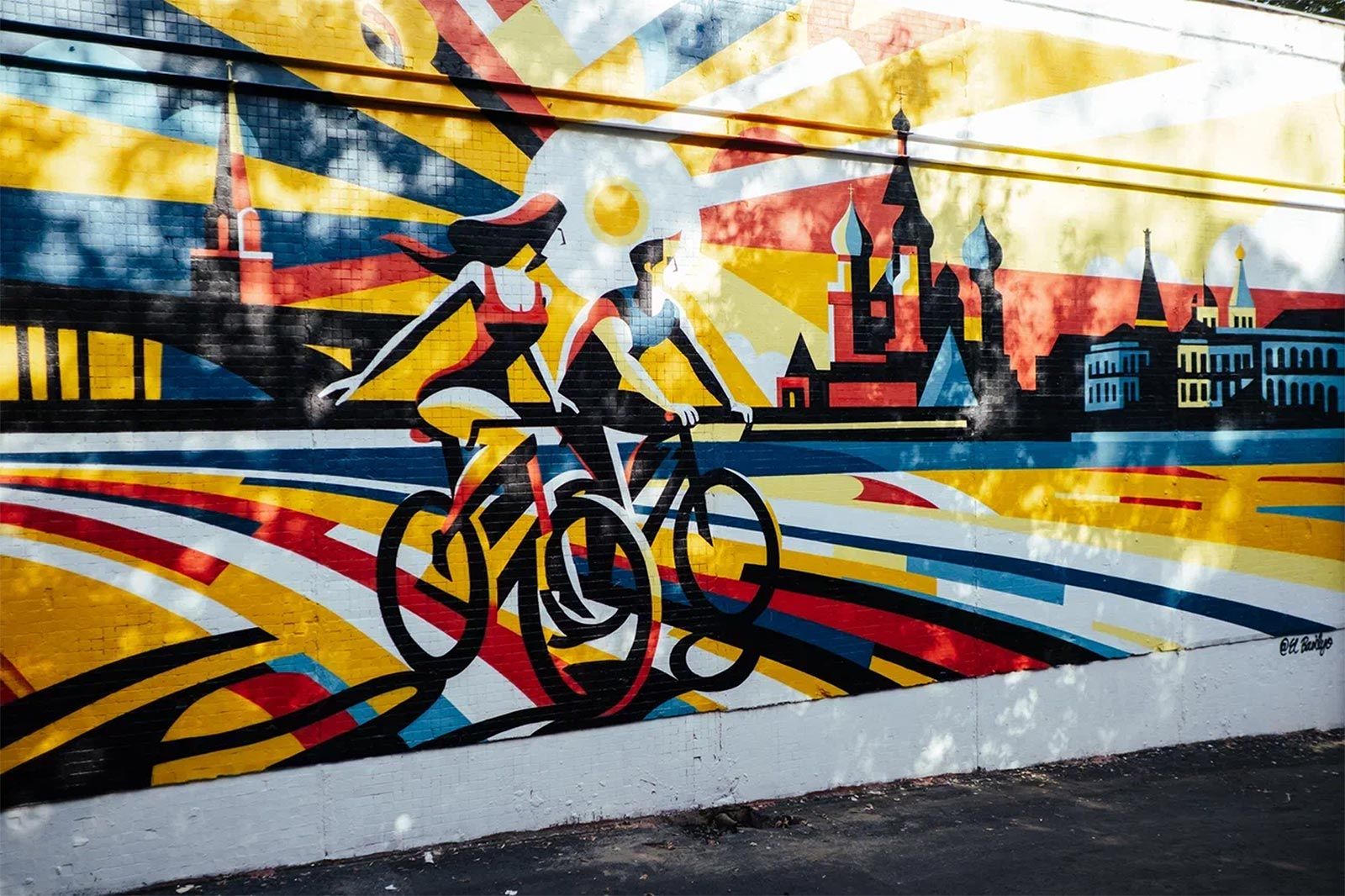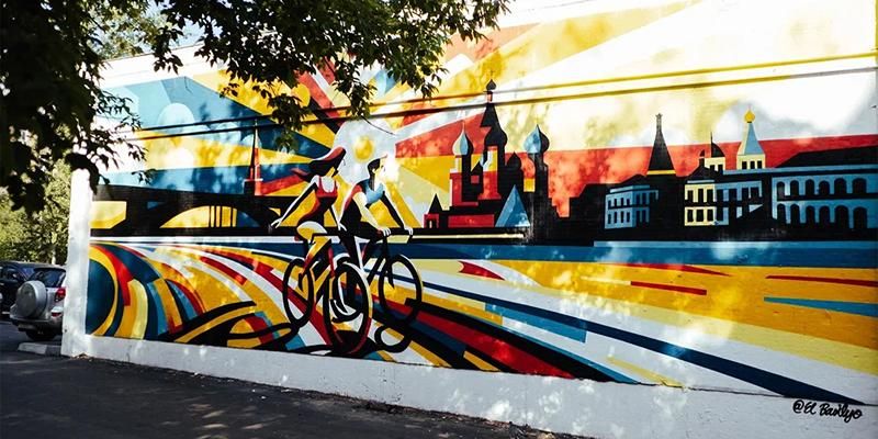 Еще один граффити Василия Родионова, «Прогулка на своих двоих», располагается на улице Свободы (дом 18, строение 1). Здесь молодой человек работал в новой для себя технике, используя геометрические формы и яркие цвета, чтобы показать легкость и красоту велопрогулки по набережной Москвы.