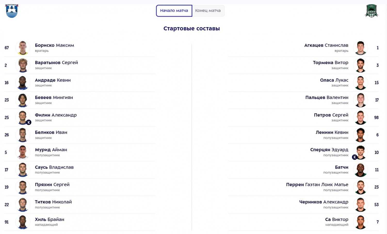 Стали известны стартовые составы "Балтики" и "Краснодара" на матч 15-го тура чемпионата России.