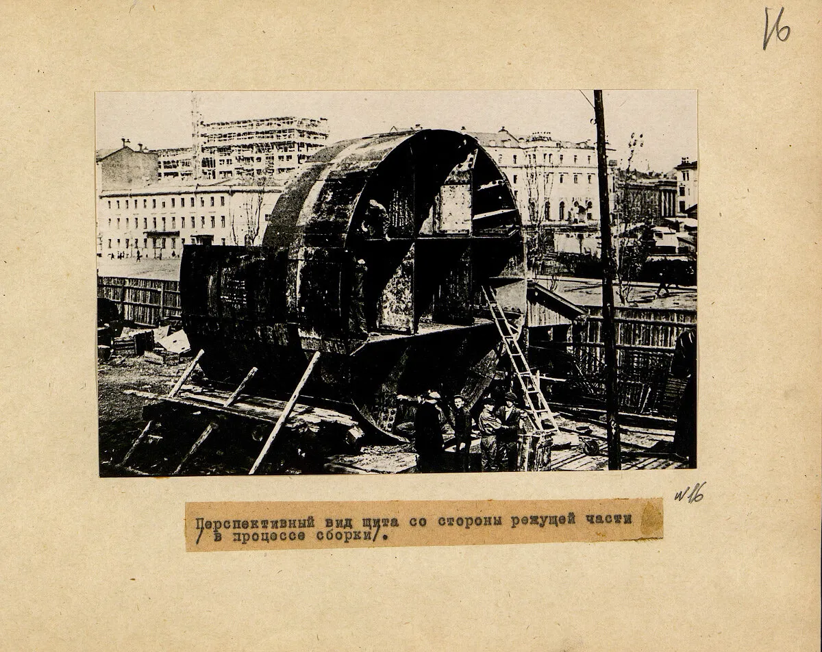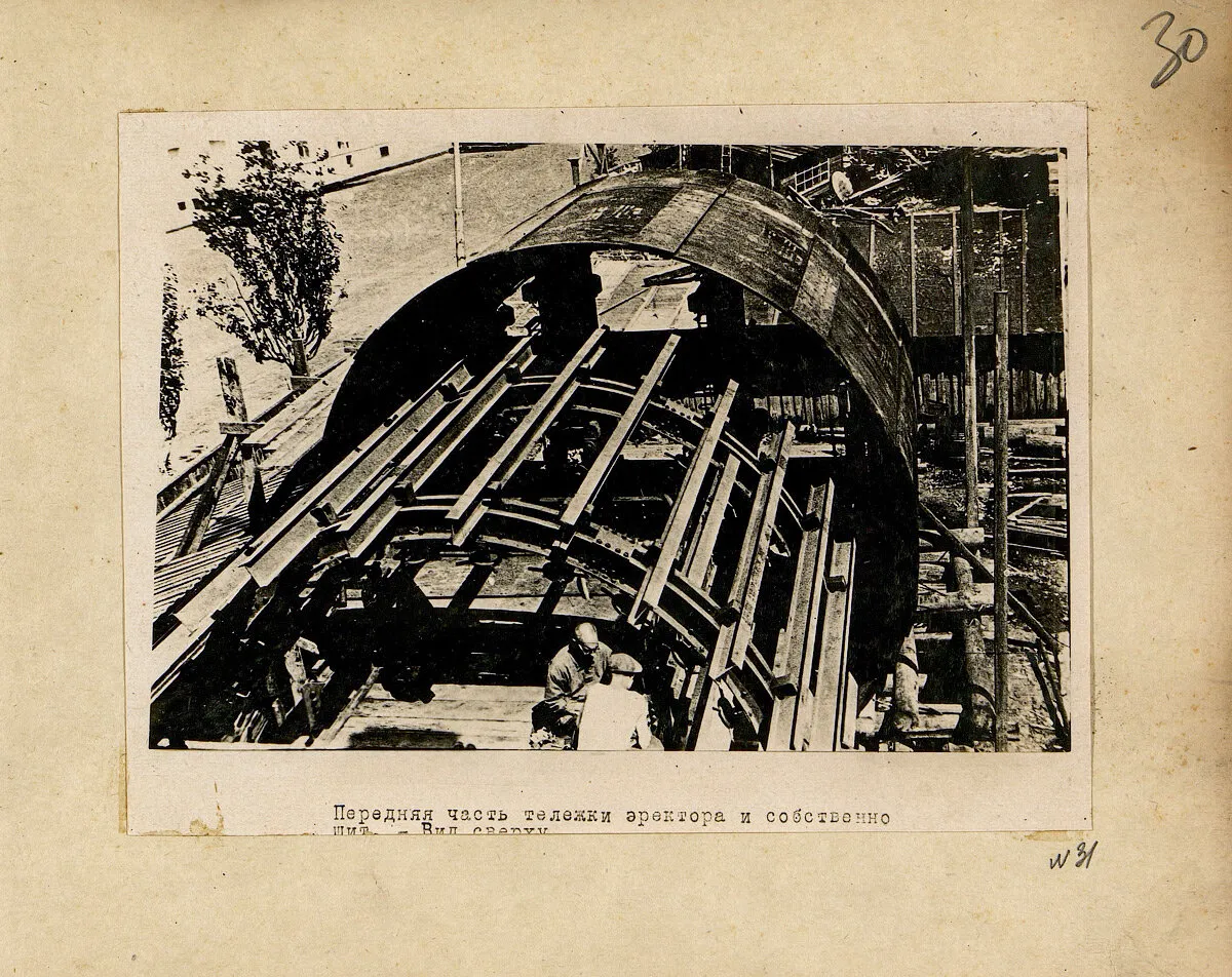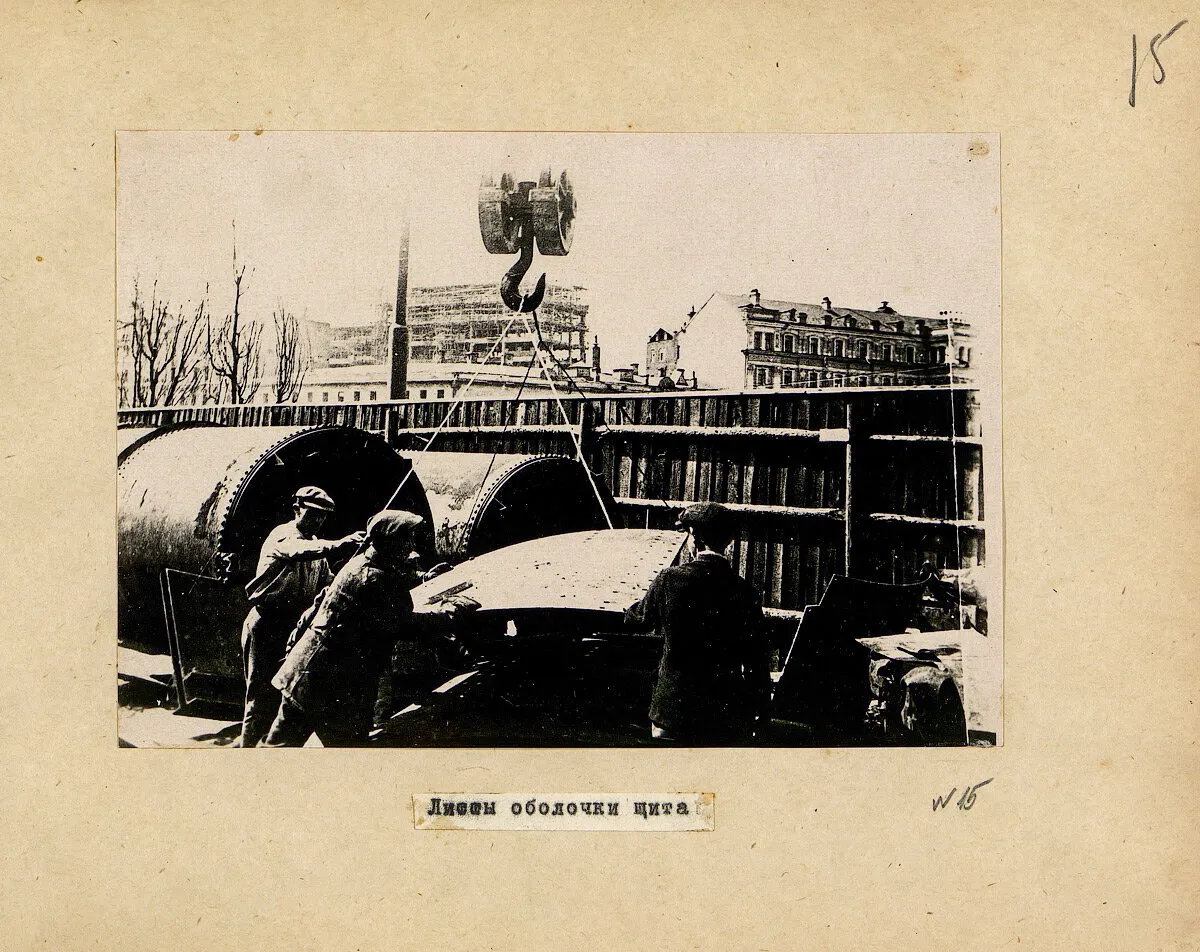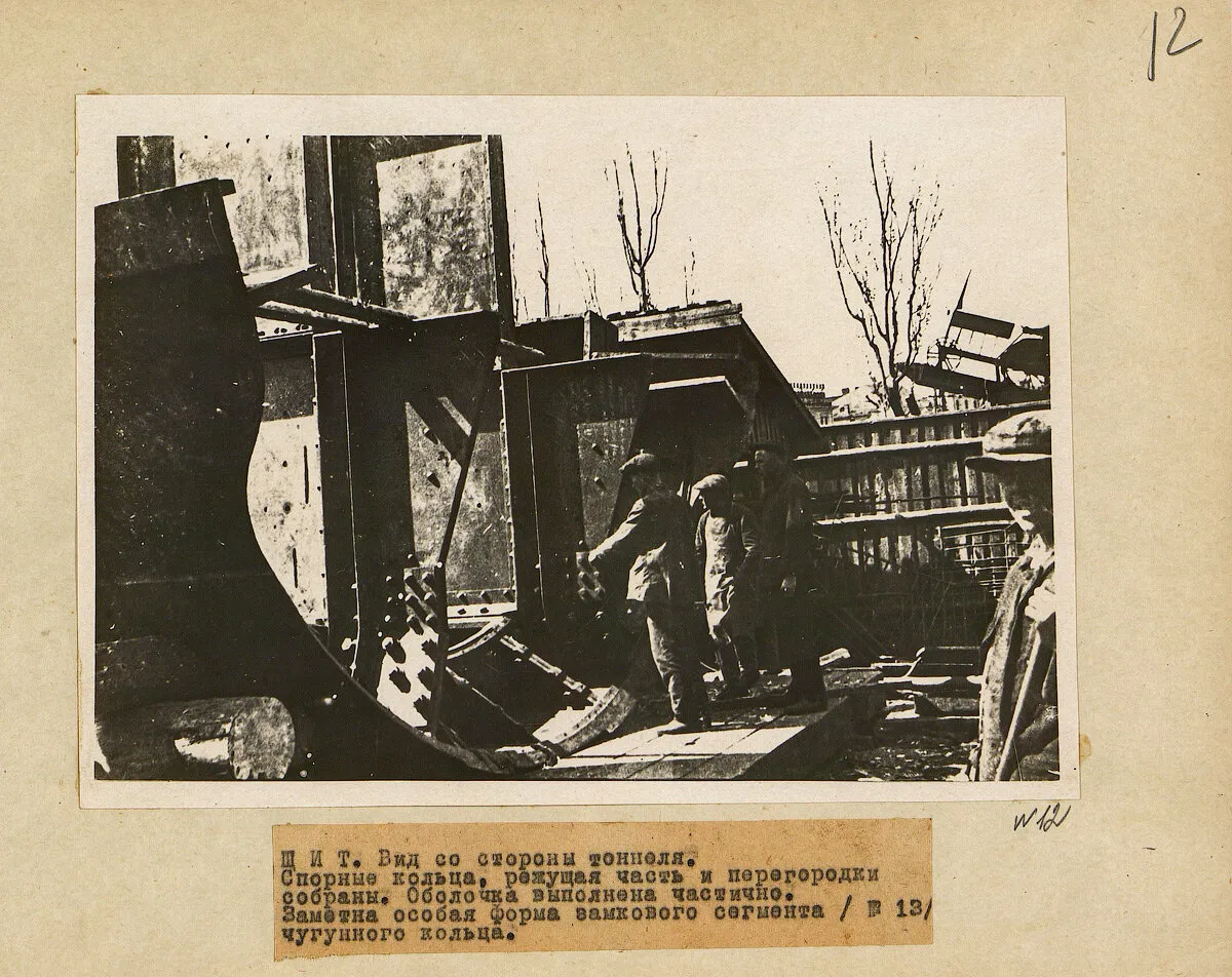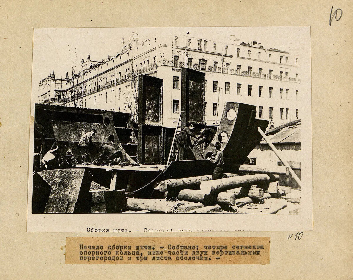 В Центральном Архиве города Москвы это дело называется: «Фотоальбом работ по монтажу проходческого щита за 1933 г. Том II» (ЦАГМ. Ф. Р-665. Оп. 1. Д. 97.). Первый том содержит почти такие же фотографии, но там они не подписаны. В дальнейшем мы с вами посмотрим и его.
