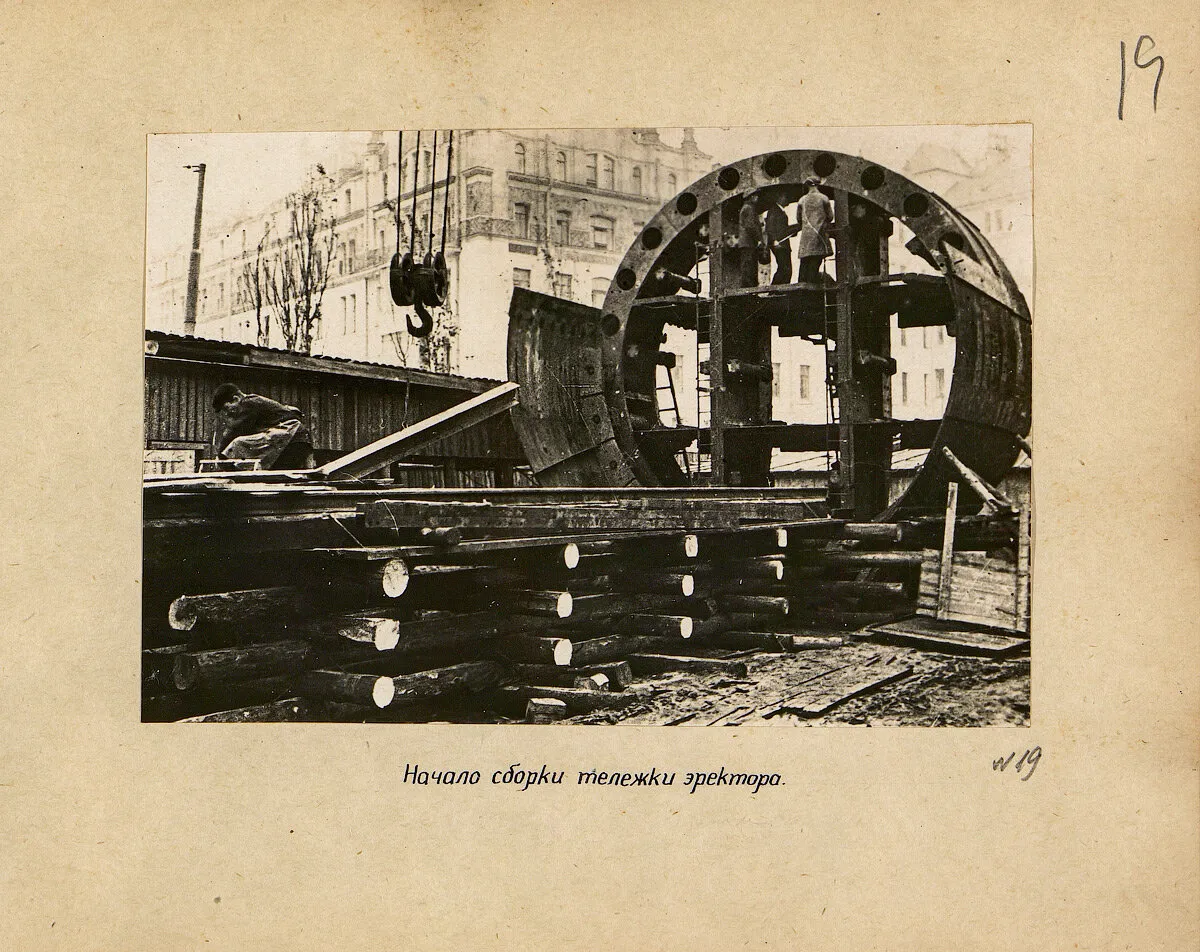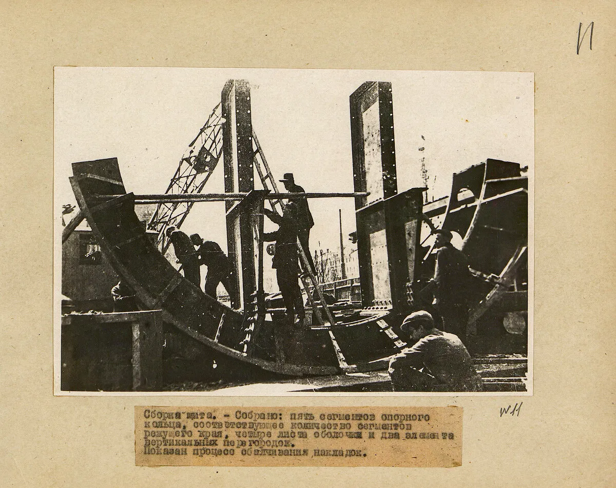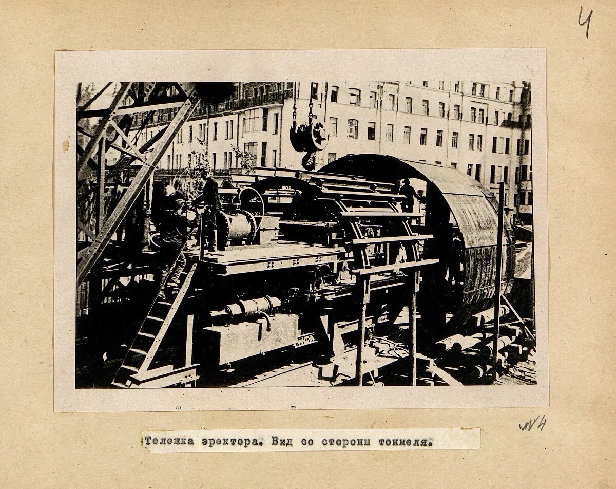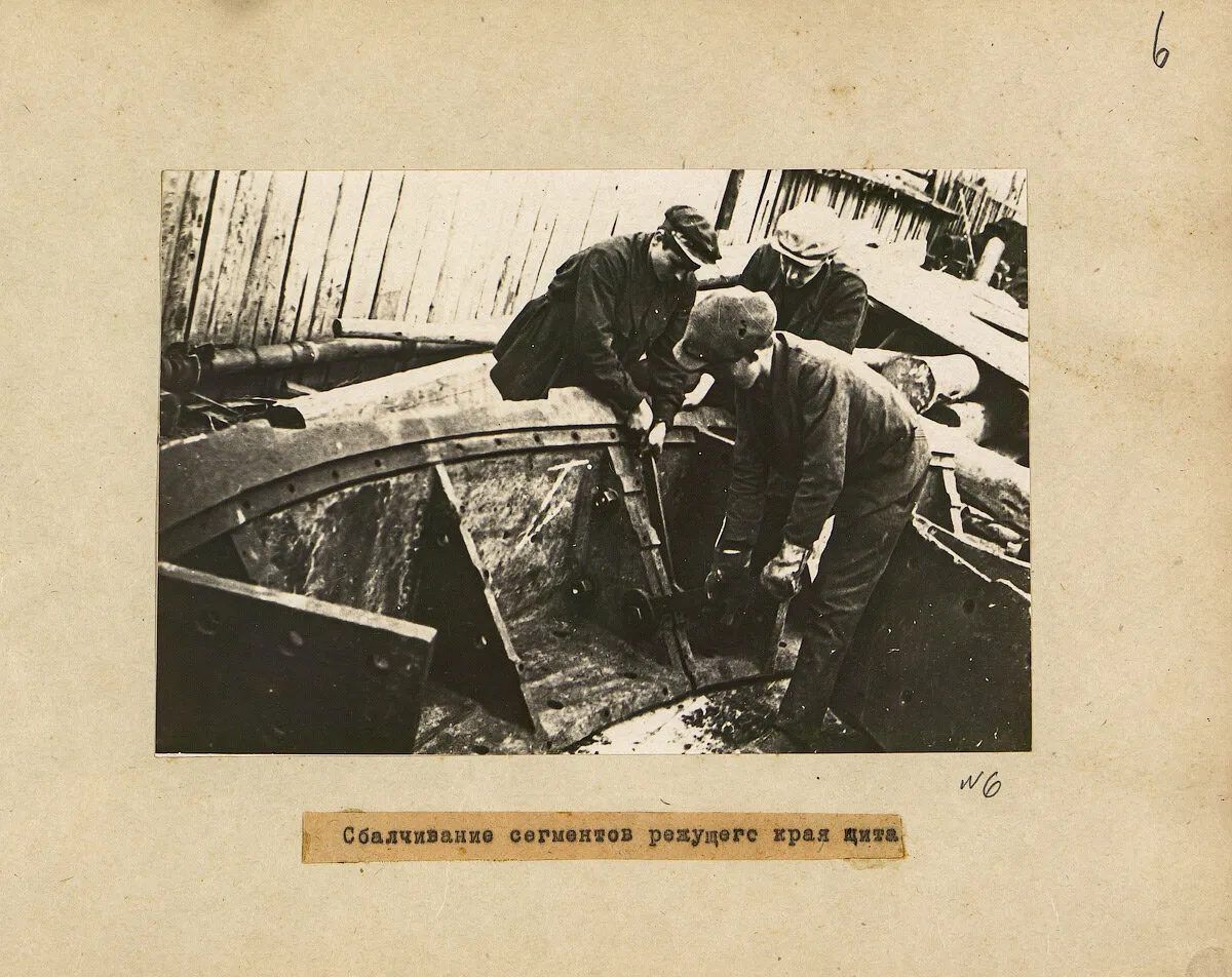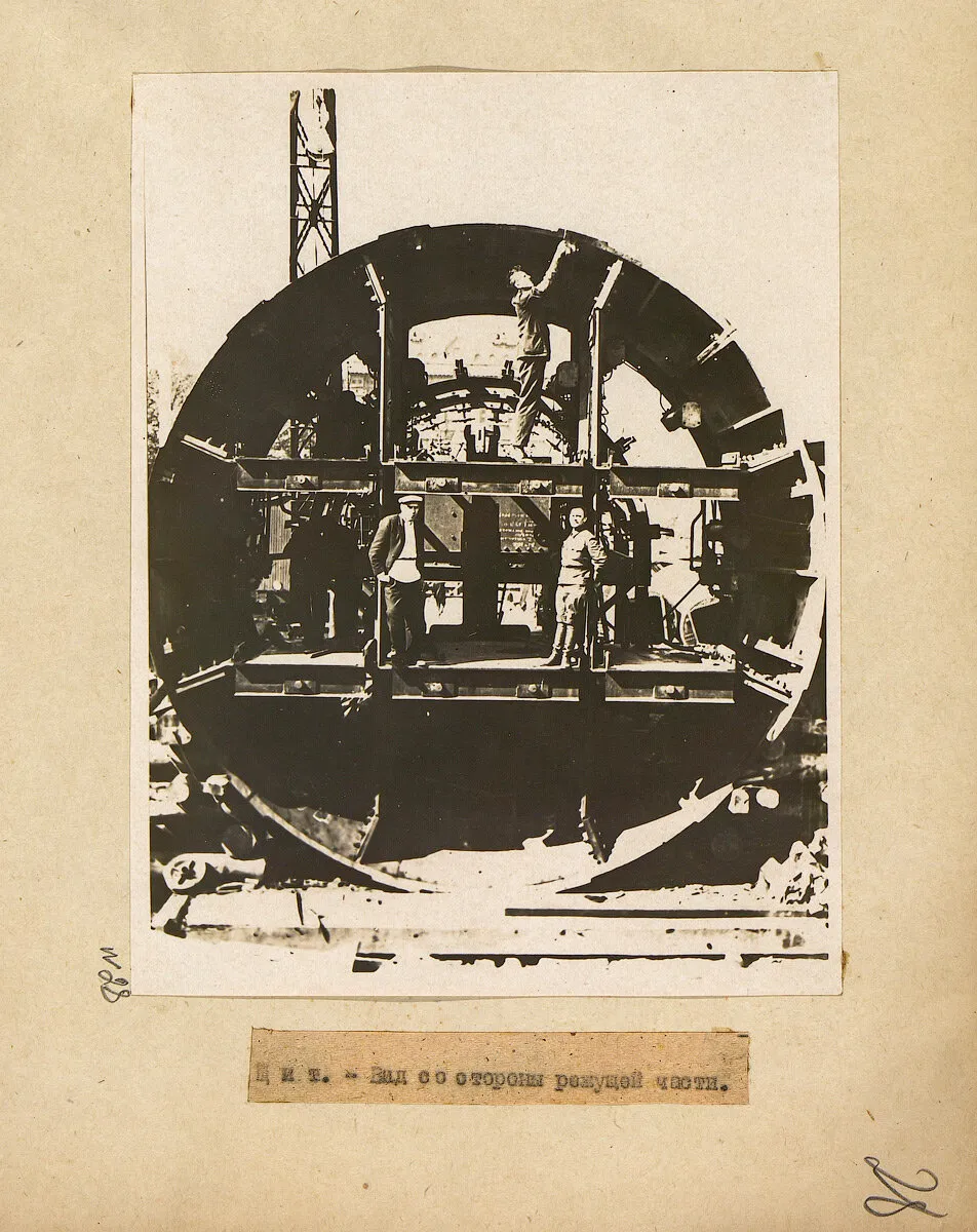 В Центральном Архиве города Москвы это дело называется: «Фотоальбом работ по монтажу проходческого щита за 1933 г. Том II» (ЦАГМ. Ф. Р-665. Оп. 1. Д. 97.). Первый том содержит почти такие же фотографии, но там они не подписаны. В дальнейшем мы с вами посмотрим и его.