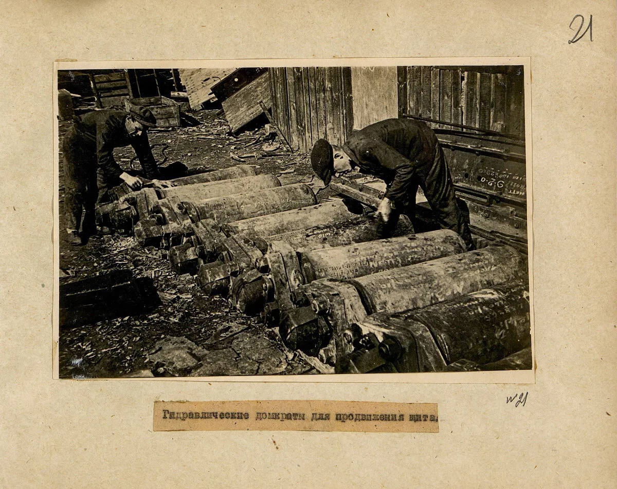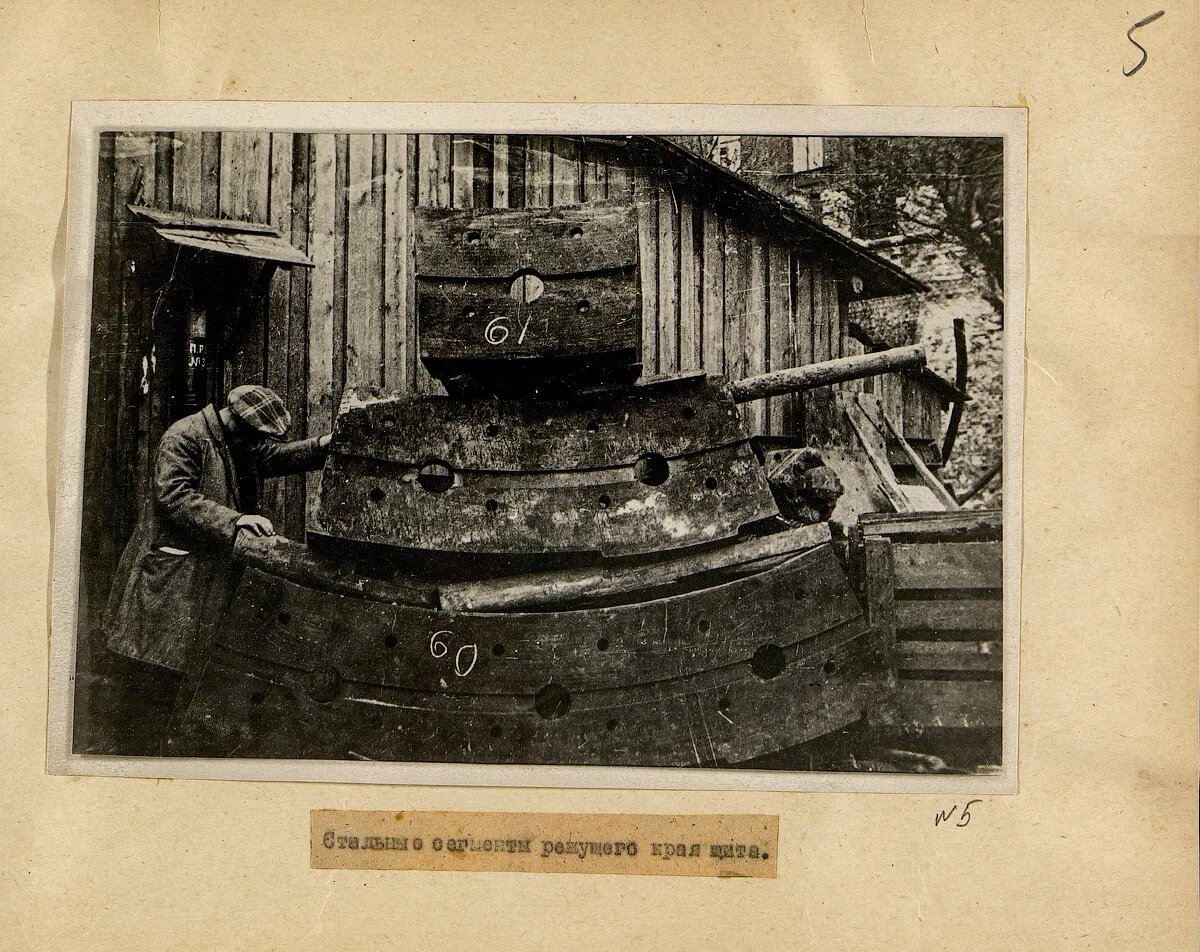 На данных фотографиях показана контрольная сборка английского щита на поверхности. В дальнейшем его снова разобрали, спустили в шахту № 12 и заново собрали в монтажной камере.