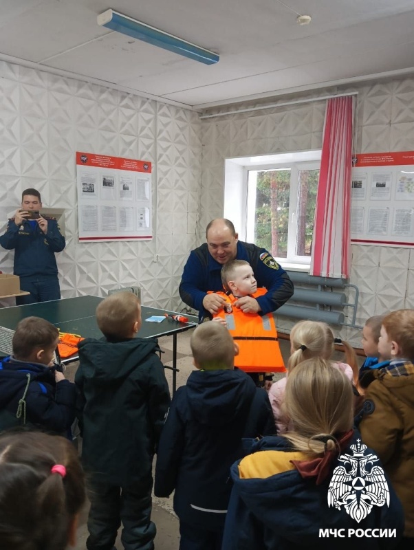 Сотрудники ГИМС МЧС России продемонстрировали дошколятам, как правильно надевать спасательный жилет, а также как кидать спасательный круг и конец Александрова (средство для оказания помощи тонущим людям).