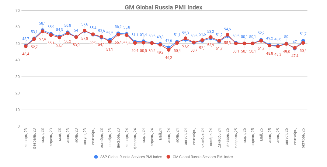 Индекс GM Global Services Russia PMI вырос до 50,4 п.п., что выше сентябрьского значения в 47,4 п.п. и указывает на возобновление роста деловой активности. Параллельно индекс S&P Global Russia Services PMI поднялся до отметки 51,7 п.п., вновь оказавшись в зоне роста и показав улучшение с уровня сокращения 47,0 п.п. в сентябре.