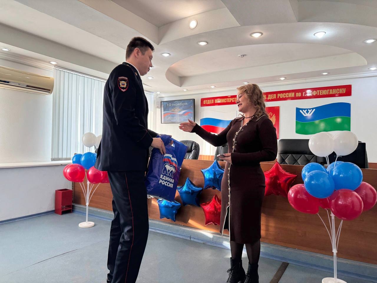 В Нефтеюганске активисты местного отделения партии вручили подарок участковому полиции Алтаю Бурдинову, который принимал участие в конкурсе «Народный участковый–2025».