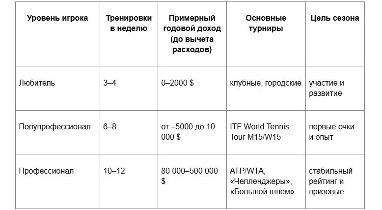 Доход сильно зависит от рейтинга и спонсоров. Игроки топ-200 получают от 80 до 300 тысяч долларов в год до вычета расходов. Но без поддержки брендов даже эта сумма может уменьшаться вдвое. - Чем отличается инструктор по теннису от тренера?