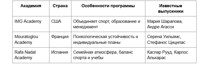Академии нового поколения — IMG (США), Mouratoglou (Франция), Rafa Nadal Academy (Испания) — совмещают спорт с образованием. Здесь спортсменов учат планировать, анализировать, принимать решения. Это не школа ударов, а университет взрослой жизни.