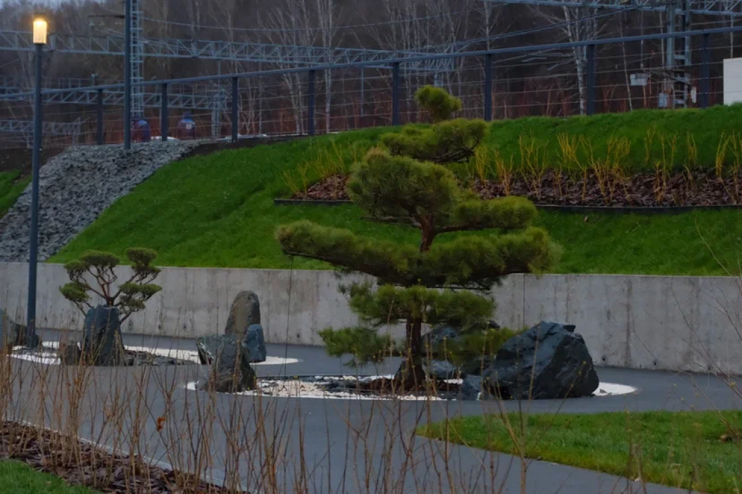 На новом участке набережной разместили скамейки и уличные кресла, там появились освещение, детская площадка-песочница и «город-сад». В нем разместили клумбы с деревьями, кустарниками и многолетними растениями, выращенными в местных питомниках, а использованные в декоре булыжники привезли с Вижайского каменного карьера.