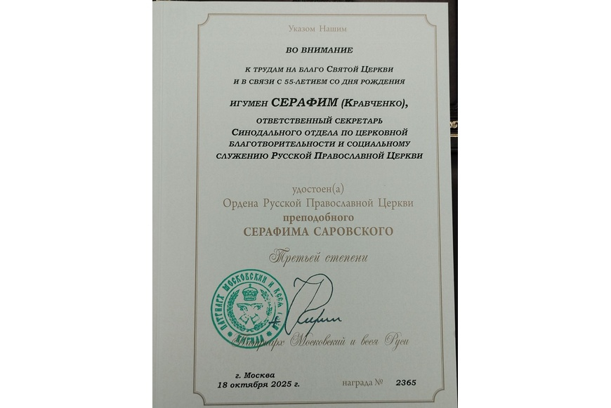 Указом Святейшего Патриарха Московского и всея Руси Кирилла, Председателя Комитета Почетных членов ИППО, во внимание к трудам на благо Святой Церкви и в связи с 55-летием со дня рождения ответственный секретарь Отдела по церковной благотворительности и социальному служению Московского Патриархата игумен Серафим (Кравченко) удостоен ордена преподобного Серафима Саровского III степени.