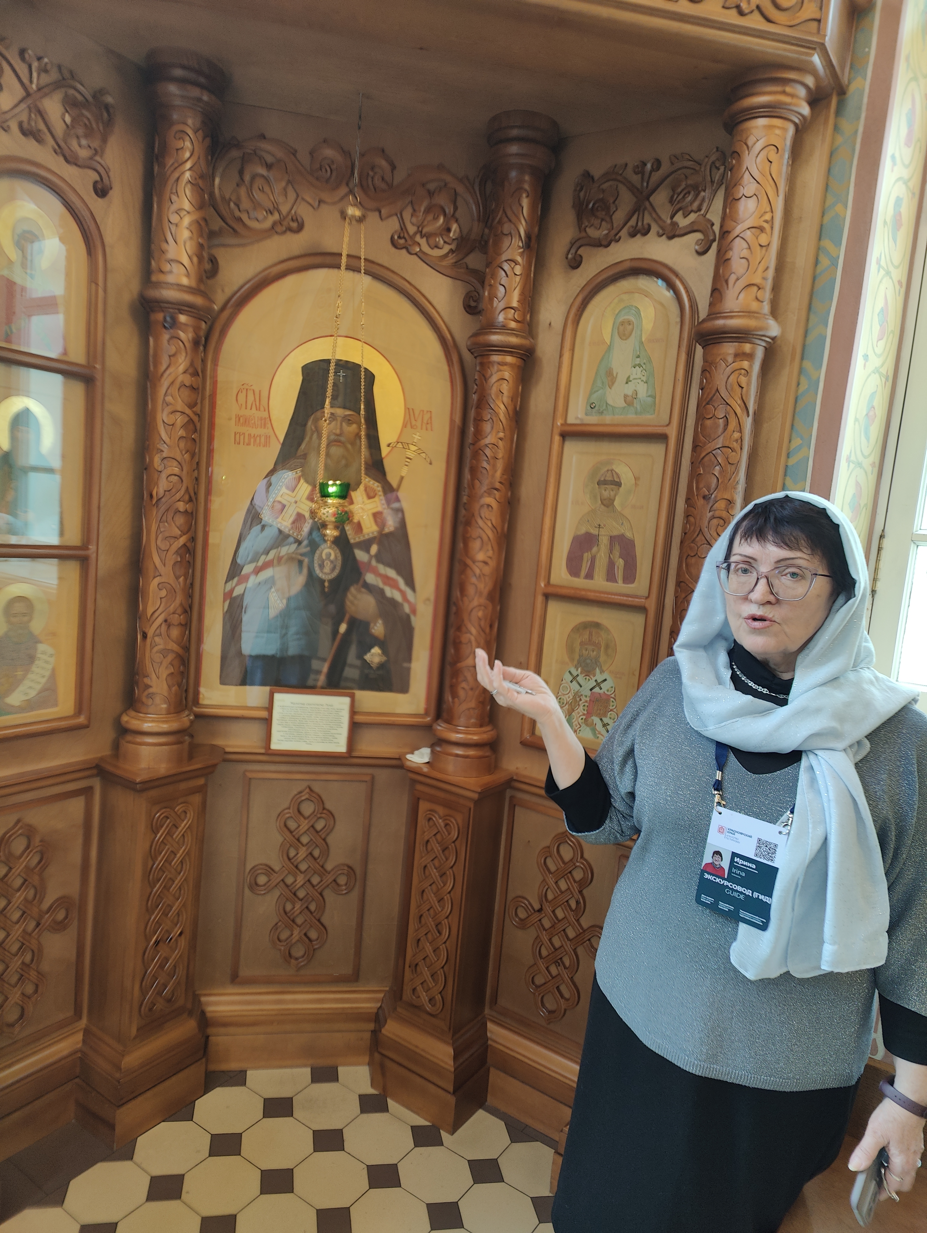 «В притворе нас тепло встретили экскурсовод Ирина Колосова, заведующая библиотекой прихода, и звонарь храма Станислав Савчук. С первых минут они создали атмосферу доброжелательности и искреннего интереса к нашему визиту. Под их руководством мы поднялись на колокольню, где Станислав показал своё мастерство звонаря и поделился знаниями о колоколах. Несмотря на крутые ступени, душевный подъём преодолел любые трудности, - рассказала председатель регионального отделения «ВоИна» Татьяна Пархоменко. - Затем, войдя в храм, мы с восхищением рассматривали иконостас, киоты с иконами, ковчеги с мощами и фрески в византийском стиле. Ирина Колосова увлекательно рассказала об их значении, о библейских сюжетах, изображённых на стенах: Воскресении Христа, Крещении Господнем, Рождестве святого Иоанна Предтечи и других. Поднявшись на клирос, мы познакомились с трудом певчих и старинными изображениями святых — архангела Рафаила, Романа Сладкопевца, Иоанна Дамаскина, а также увидели уникальную фреску Спаса Нерукотворного».