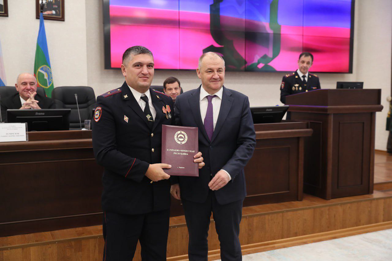 Глава КЧР поблагодарил виновников торжества за профессионализм и самоотверженную службу на благо России и вручил государственные награды и почетные звания сотрудникам МВД по КЧР, отличившимся в службе. Также поздравил министра МВД по КЧР Владимира Нефедова с присвоением ему Президентом России Владимиром Путиным высокого звания генерал-майора полиции.