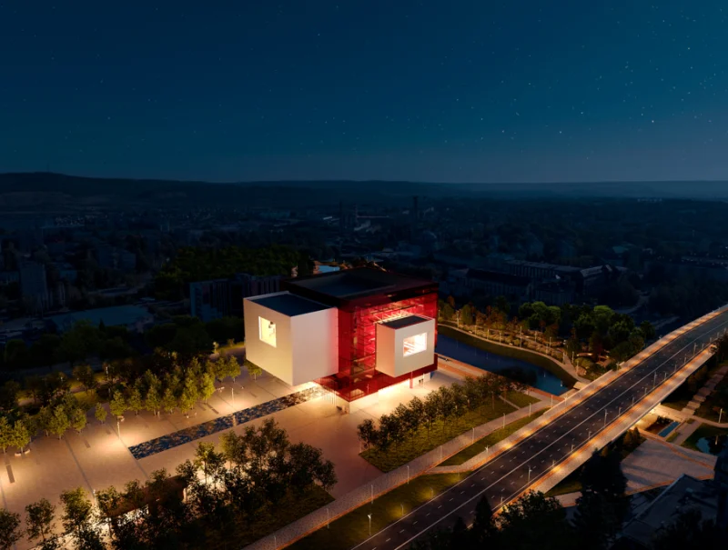 «По проекту в здании будет несколько залов – большой концертный, рассчитанный на 1,07 тыс. мест, и три универсальных. Два из них будут вмещать по 54 человека, а третий универсальный концертный зал – 167. Кроме того, в комплексе будет ресторан на 100 мест. Здание запроектировано в виде куба, стоящего на четырех опорах, с консольно выступающими прямоугольными объемами залов на 4-8 этажах.», – рассказал представитель Главгосэкспертизы России, главный эксперт проекта Андрей Крыль.