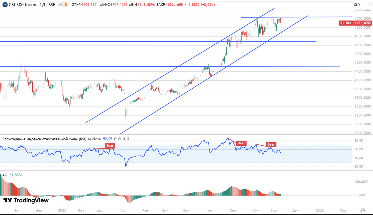 Китайский индекс CSI300 движется в восходящем канале. Однако ему не удается пробить уровень сопротивления 4700 пунктов и он третий раз корректируется от этих значений. В случае краткосрочного негатива возможна коррекция до 4450 п.