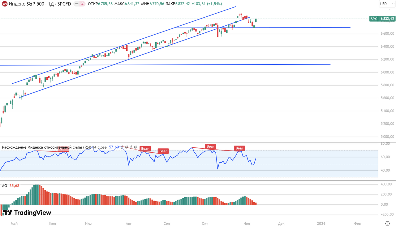 Американские фондовые индексы завершили понедельник сильным восстановлением. По итогам понедельника S&P 500 прибавил 1,54% до уровня в 6832 п. Nasdaq Composite вырос на 2,27% до 23 527 п. Dow Jones Industrial Average вырос на 0,81% до 47 368,10 п. Основной позитив пришелся на заявления Дональда Трампа о прекращении шатдауна в ближайшие дни и восстановлении отношений с Китаем.