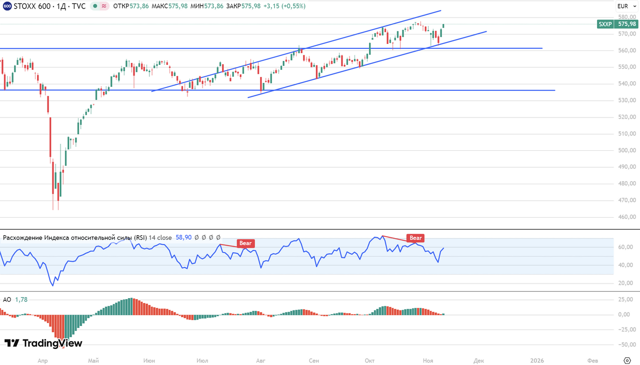 Европейский индекс STOXX600 растет в восходящем канале. Техническая картина выглядит как идеальный отскок от нижней линии тренда вблизи линии поддержки. Такой сигнал часто ведет к долгосрочному росту, который мы и наблюдаем, при этом пока что индекс не перегрет (RSI = 59п.), так что вероятно рост продолжится до границы восходящего канала.