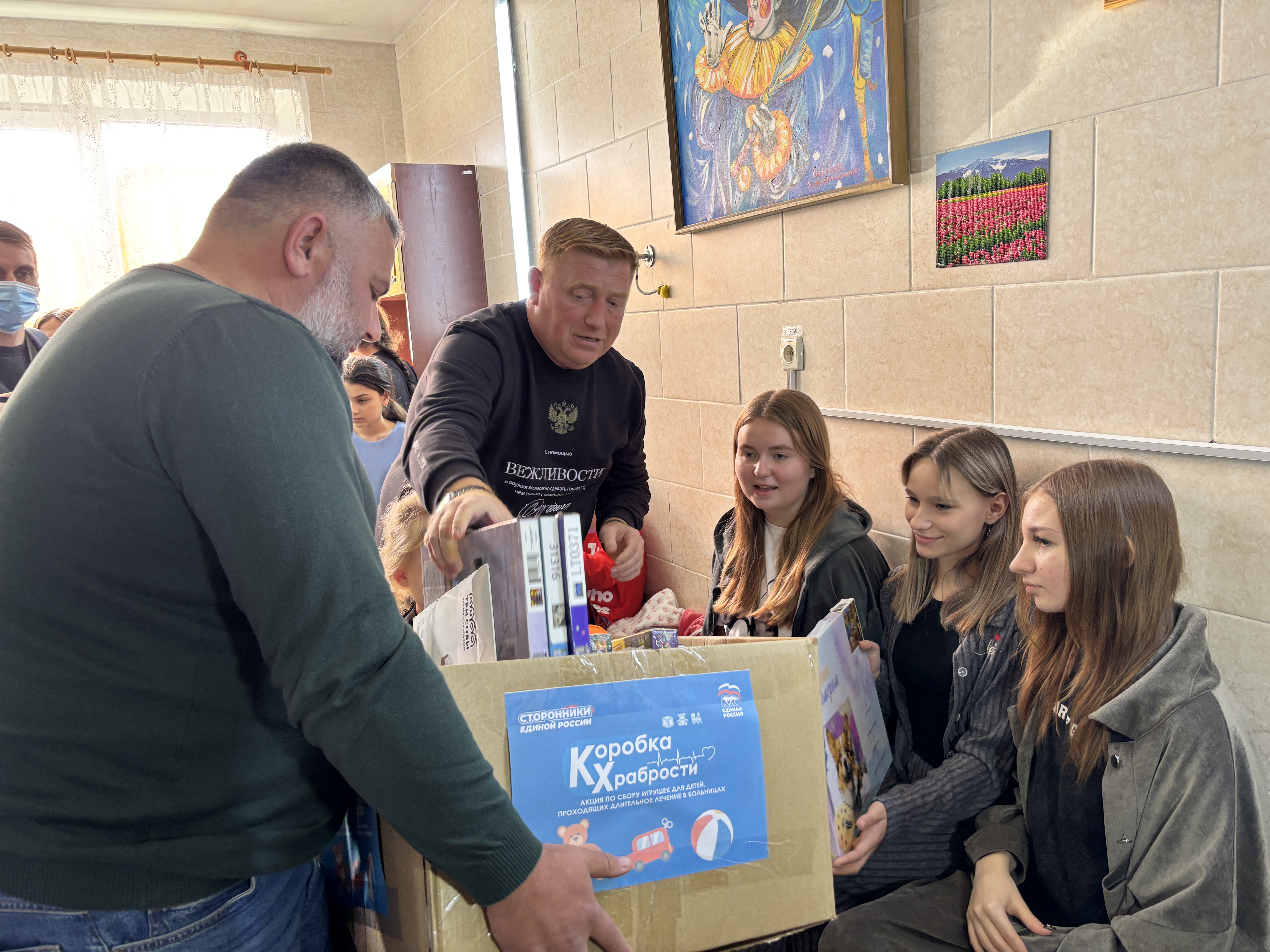 В ЛНР старт акции «Коробка храбрости» дали в Луганской республиканской детской клинической больнице. С игрушками к ребятам приехали первый замсекретаря реготделения «Единой России» Василий Леонов, руководитель Луганского фонда поддержки регионального сотрудничества и развития Максим Масленников и активисты партии. Первыми выбрали подарки юные пациенты кардиоревматологического отделения.