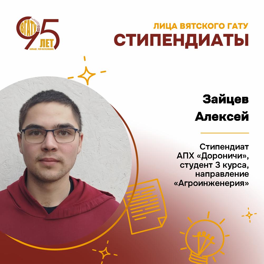 – Мы проходили практику в агрофирме «Немский», одном из подразделений AПХ «Дороничи». Занимались ремонтом и эксплуатацией тракторов – помогали сделать так, чтобы техника всегда находилась в исправном состоянии, – делится Алексей.Ответственный подход к делу был отмечен управляющим агрофирмы, а в сентябре Алексей Зайцев стал стипендиатом AПХ «Дороничи».Интересно, что инженером в сельском хозяйстве стипендиат изначально не планировал, и в Вятский ГAТУ пришел, можно сказать, случайно.
